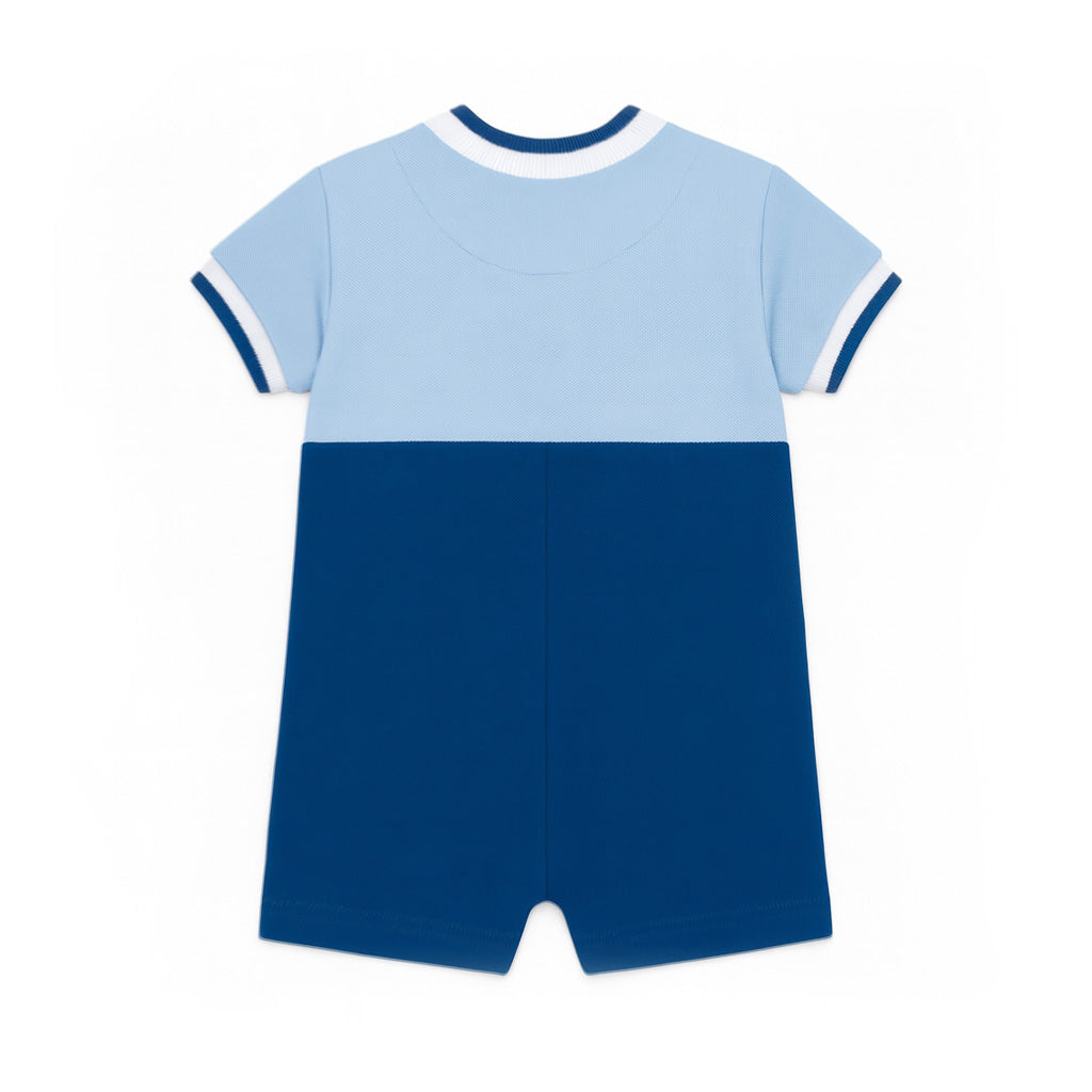 Full of seaside imagination, this shortall is crafted from soft light blue and royal interlock knit in 100% cotton. A playful appliqué pirate ship sails across the front—complete with a cheerful crab and a peek of a shark fin—bringing whimsical adventure to warm-weather days.