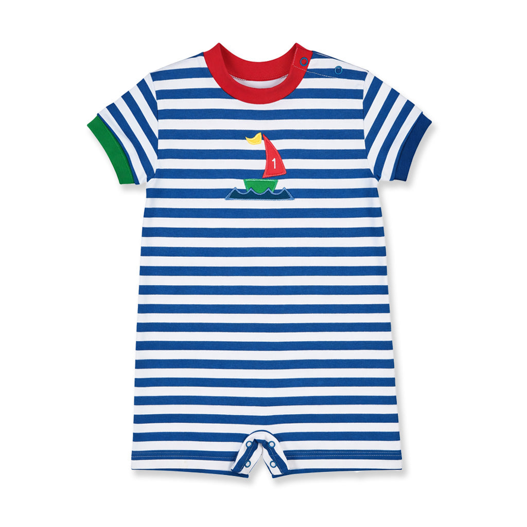 Regular price $88.00Royal and white stripes bring timeless charm to this knit shortall, finished with a cheerful sailboat detail. Thoughtful contrast ribbing adds a playful pop of color on the crew neck and sleeves.