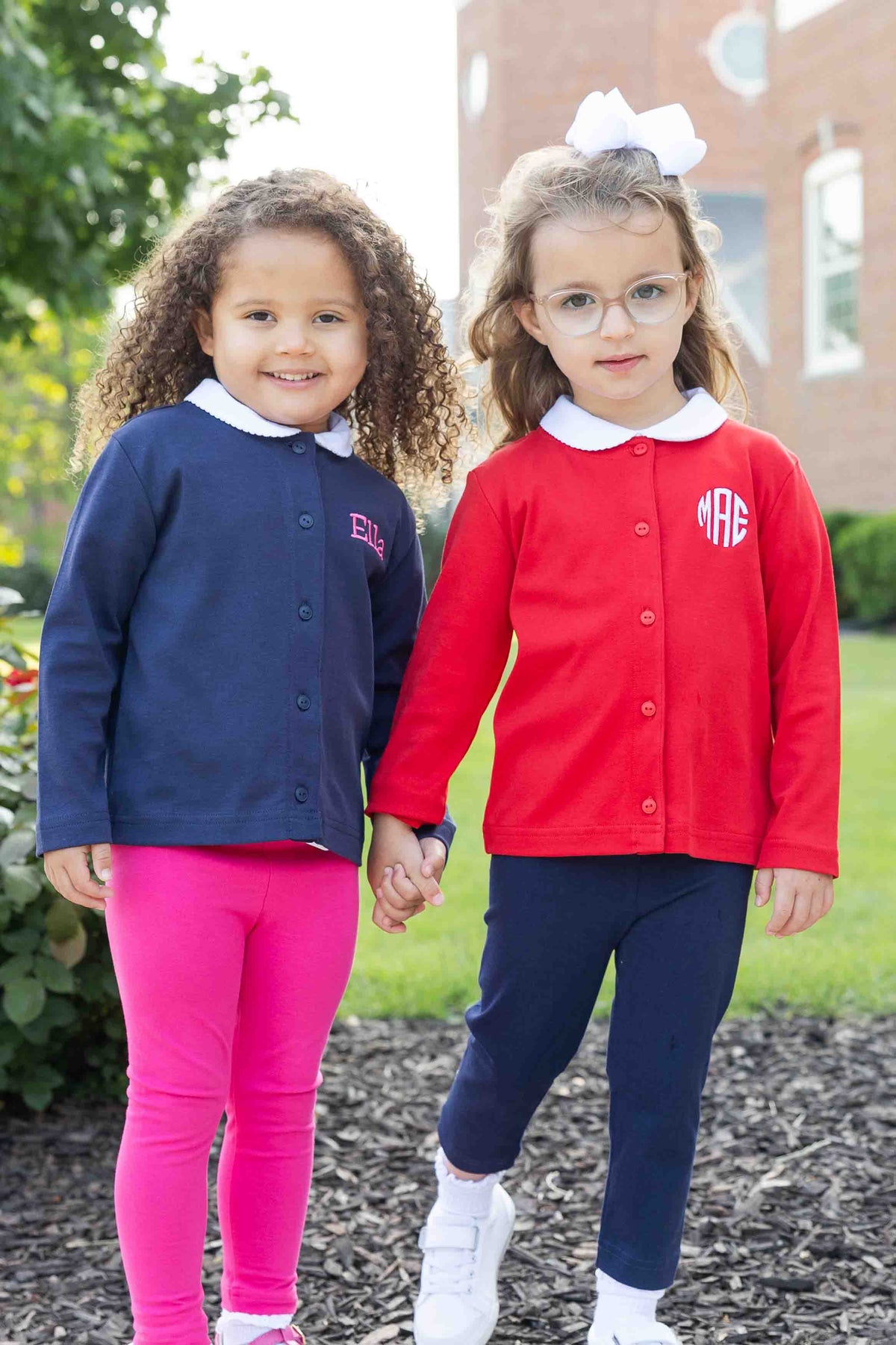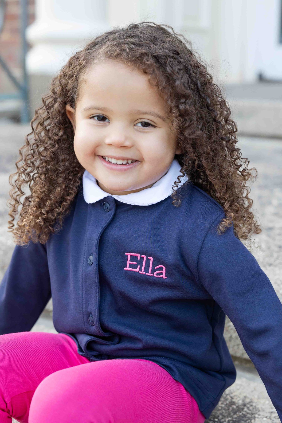 Our personalization team will make the best choice for each size and style. For the cardigans, embroidery is placed in the upper left side of the chest of the garment. For dresses, embroidery is centered on teh bib.