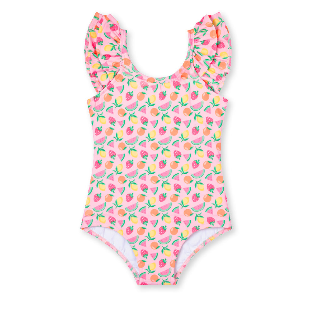 Regular price $100.00Bright, cheerful, and made for sunny days by the water, this swimsuit features our custom pink and multicolor fruit print on a soft, stretchy nylon-spandex blend. Ruffled shoulders add a sweet, playful touch, while back spaghetti ties keep the fit comfortable and secure.