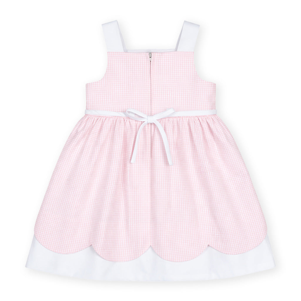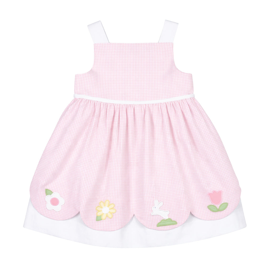 Regular price $112.00Sweet and storybook-perfect, this dress is crafted from pink and white check seersucker in soft, breathable 100% cotton—ideal for any spring celebration. Appliqué flowers and a playful bunny bring cheerful charm, while a scalloped hem adds a delicate finishing touch.