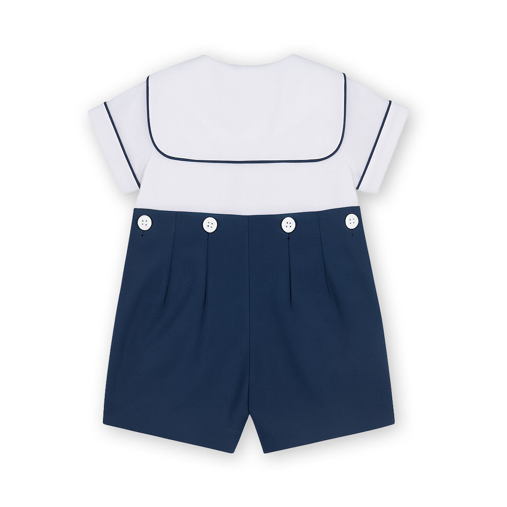 Regular price $96.00This navy button-on suit is a classic Florence Eiseman through and through. With fabric imported from Brazil, navy piping on the sleeves, front placket, and sailor collar. The navy shorts are fully lined with a snap crotch and button onto the shirt for a neat, clean look at all times. Your little guy will look like a little prince all day long!