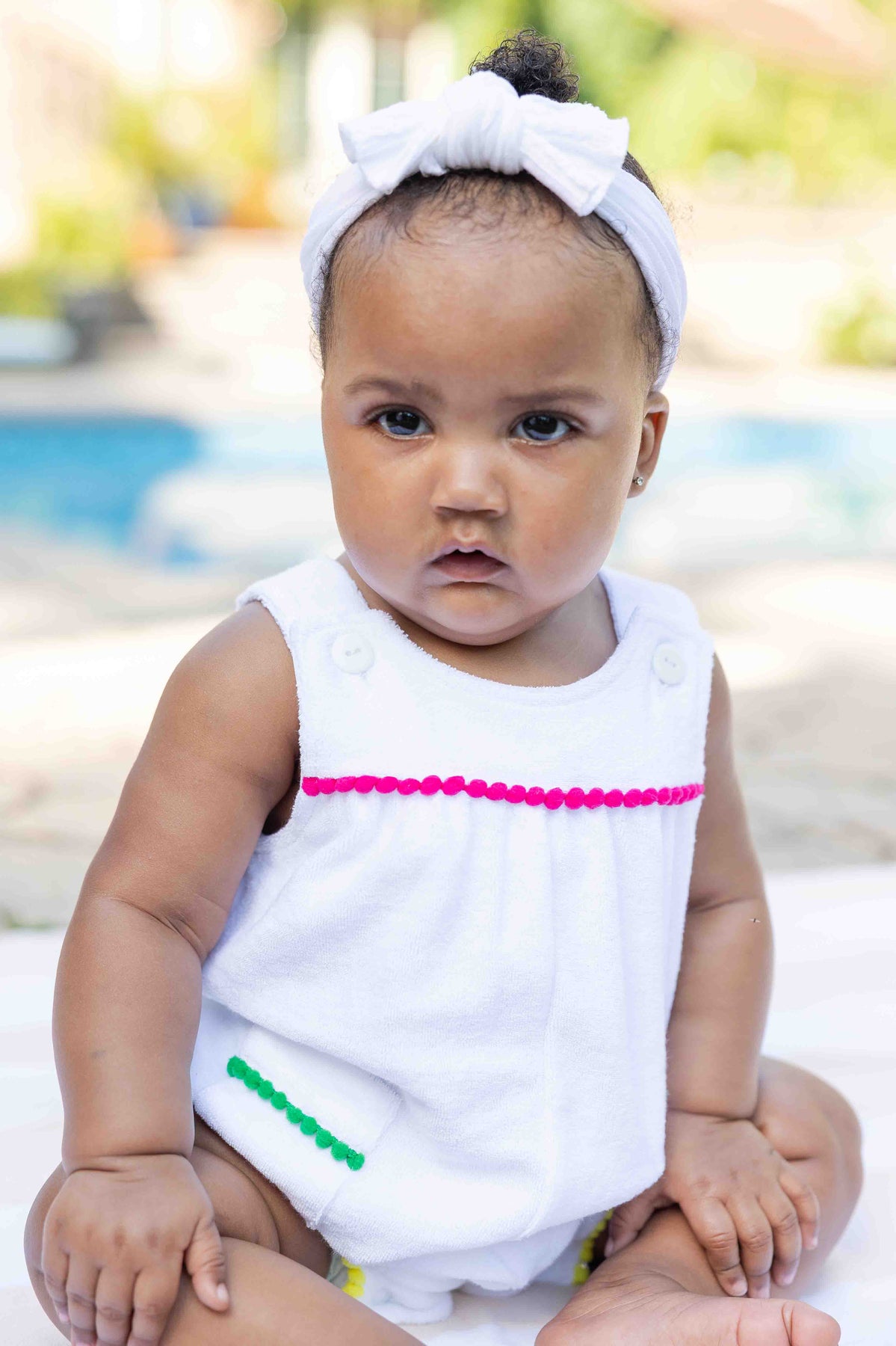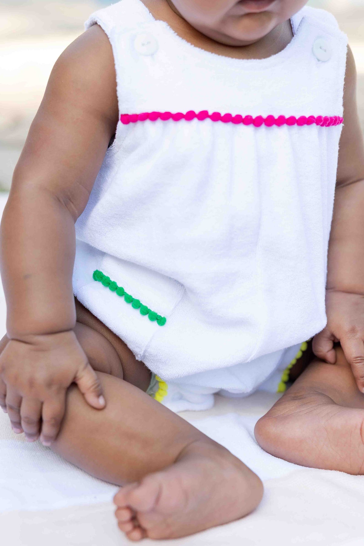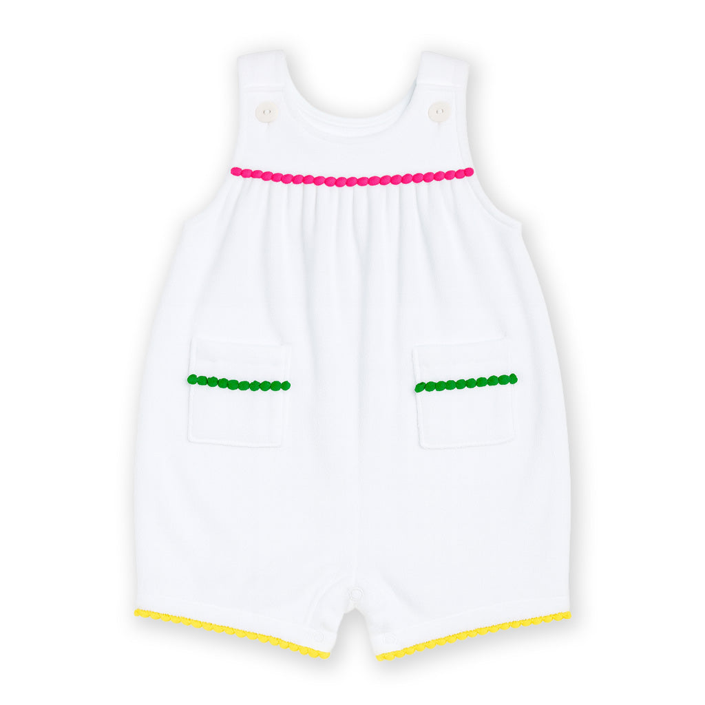 Regular price $72.00Soft, sunny, and ready for warm-weather play, this romper is crafted from white terry cloth in a cozy cotton-blend thatβs perfect for beach and pool days. Cheerful yellow, pink, and green pom poms trim the silhouette with playful color, while two patch pockets add a practical, charming touch.