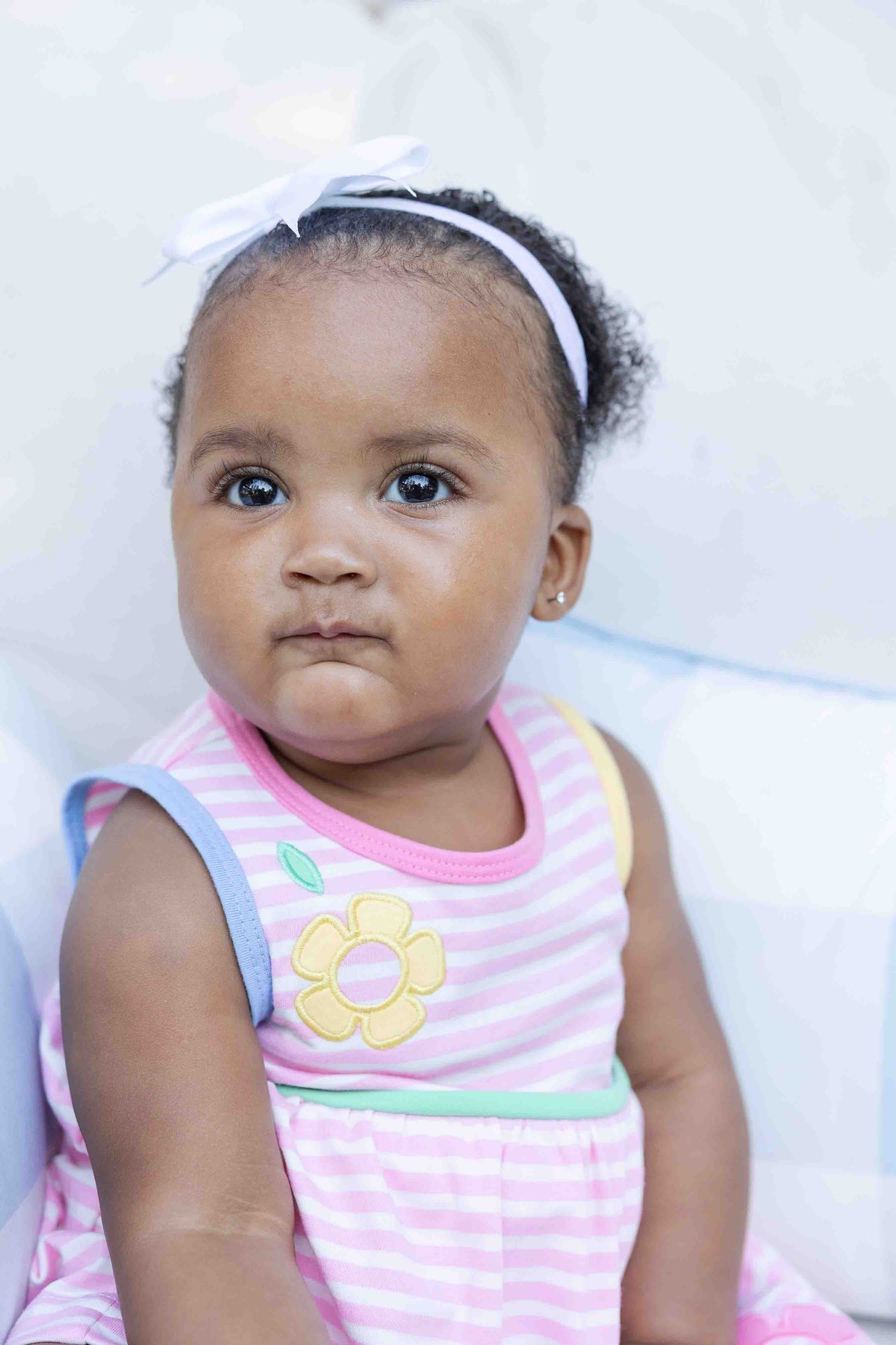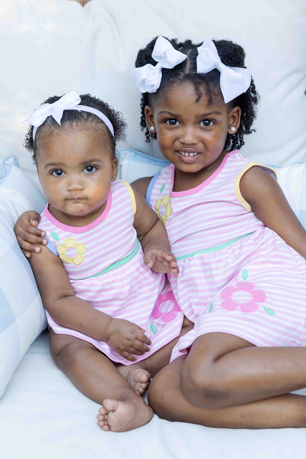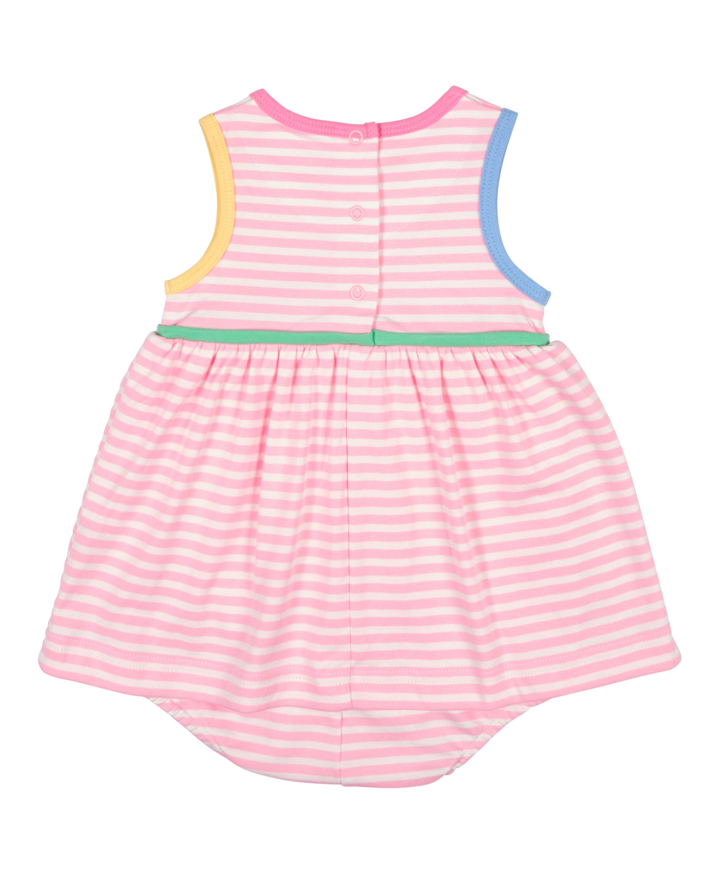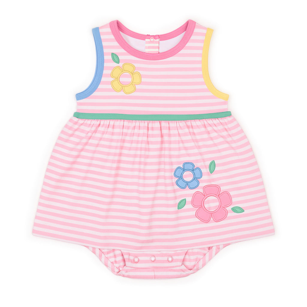 Regular price $88.00Bright, sweet, and ready for sunny play, this romper is crafted from pink and white yarn-dyed stripe interlock knit for soft, all-day comfort. Pink, blue, and yellow appliqué flowers bloom across the front, while multicolor trim at the neck, armholes, and waist adds a cheerful pop of color.