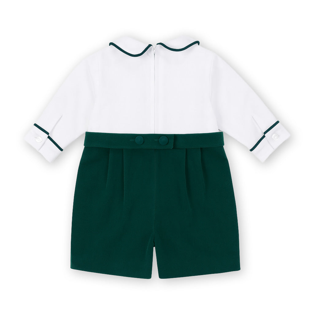 Festive and refined, this all-in-one shortall pairs rich green twill velvet with crisp white piqué for a polished holiday look. The attached shirt features a Peter Pan collar, creating the appearance of a layered ensemble with the ease of a single piece.
