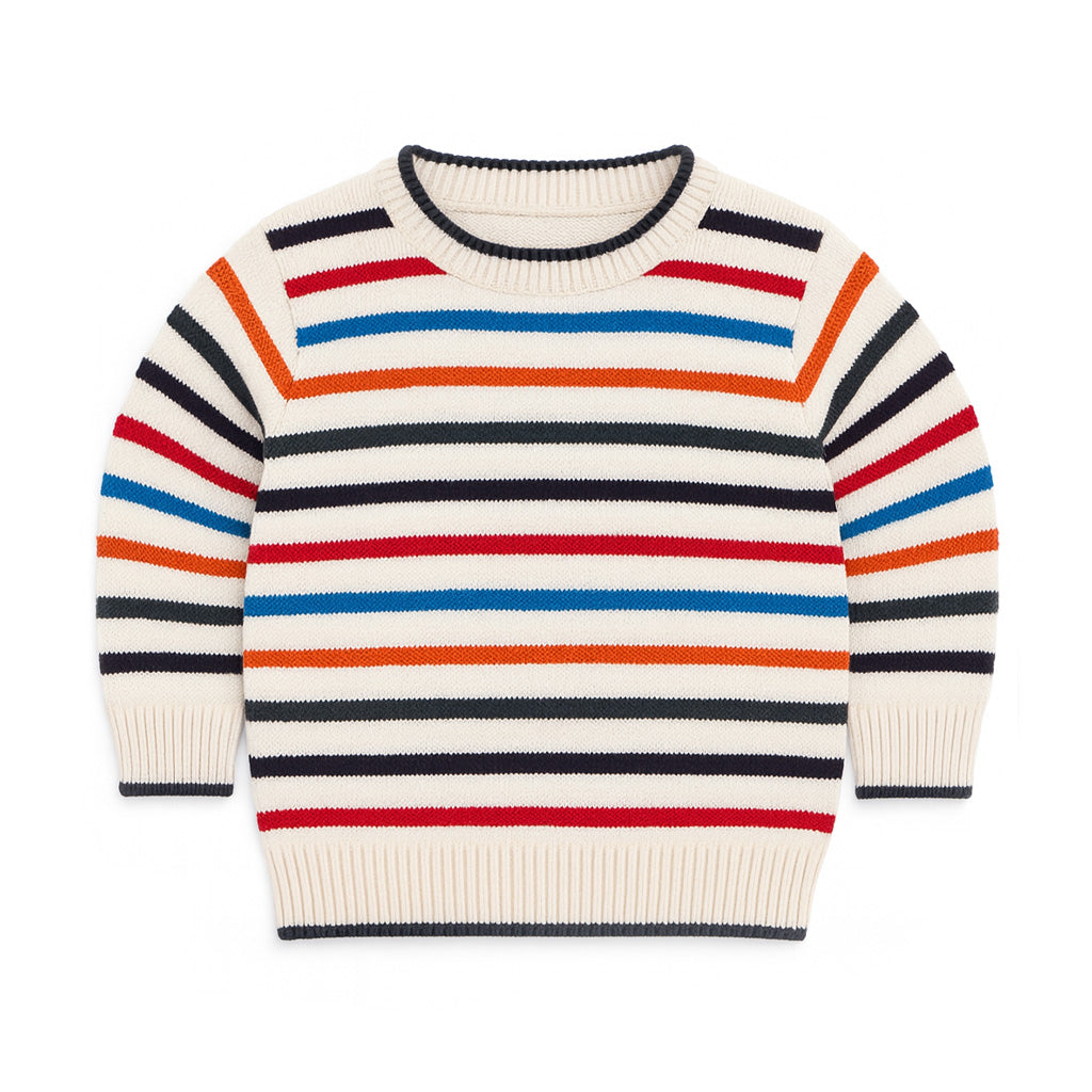 Regular price $92.00 Sale price $59.80A cozy layer with heirloom detail, this ivory cotton sweater is accented with raised stripes in mulberry, rust, slate blue, navy, and tartan green. The textured knit gives the design dimension and charm, while ivory rib trim at the neck and cuffs—tipped in green—adds a polished finish.