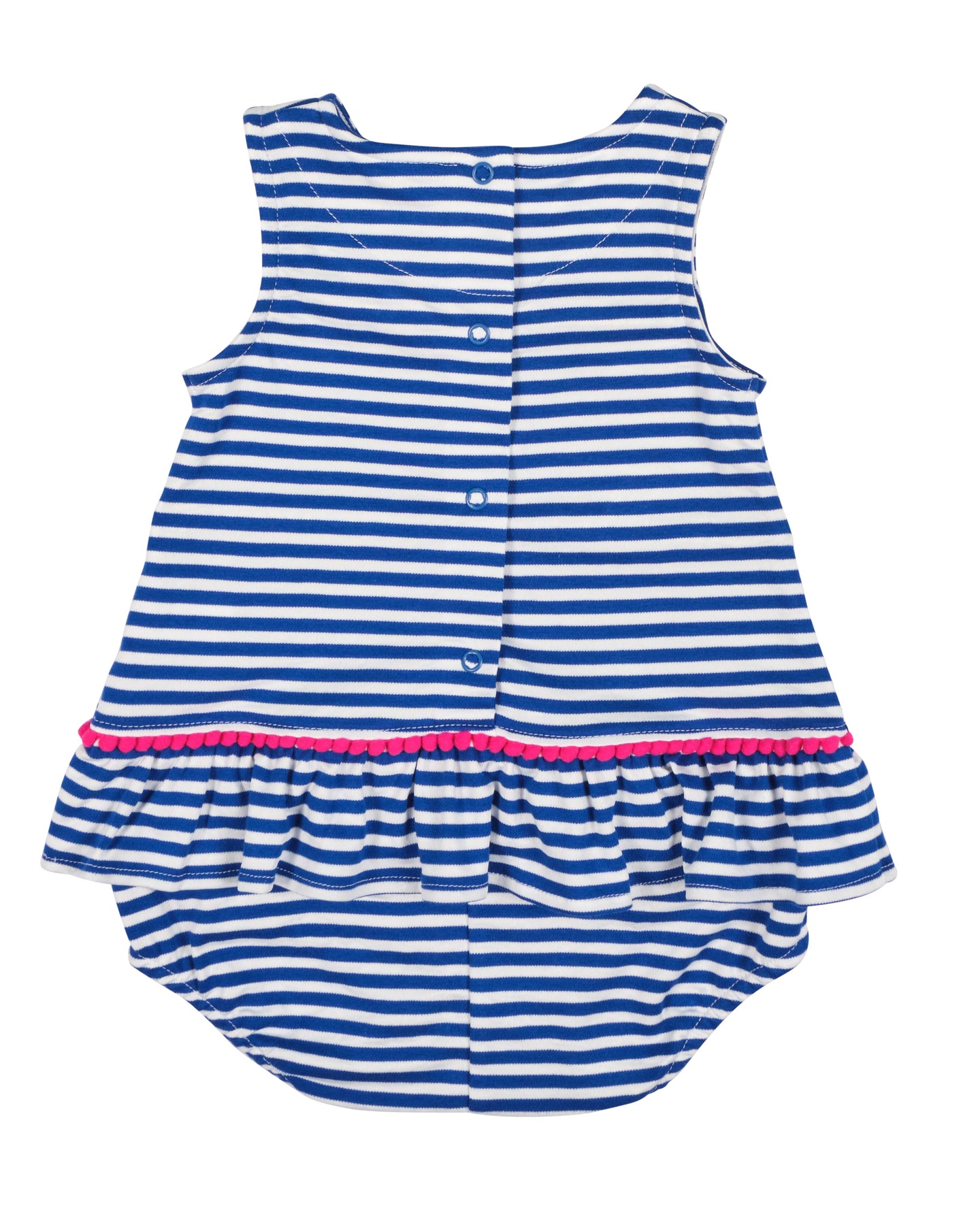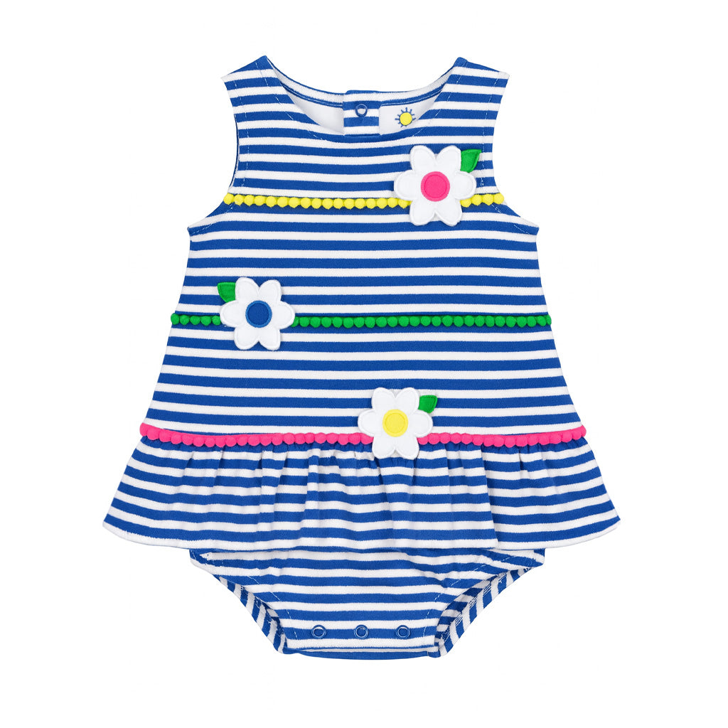 Regular price $88.00Full of color and charm, this romper is crafted from royal and white yarn-dyed stripe interlock knit for soft, durable comfort. Fuchsia, green, and yellow mini pom-pom trim adds a playful pop of texture, while bright appliqué flowers bring cheerful vacation-ready detail.
