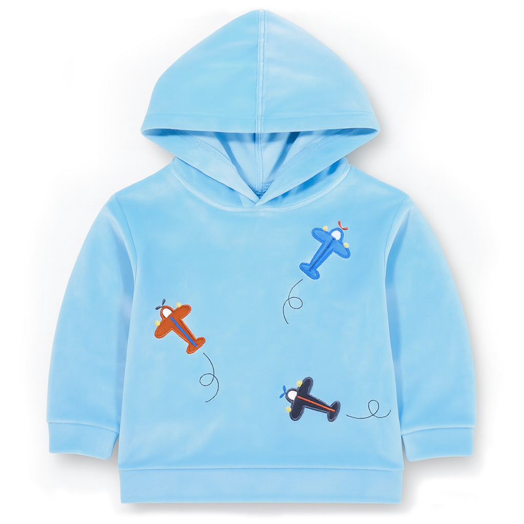 Regular price $84.00Soft and playful, this hoodie is crafted from plush blue velour with a touch of stretch for comfort. Bright appliqué airplanes in red, blue, and navy soar across the front, adding whimsical charm to a cozy classic.