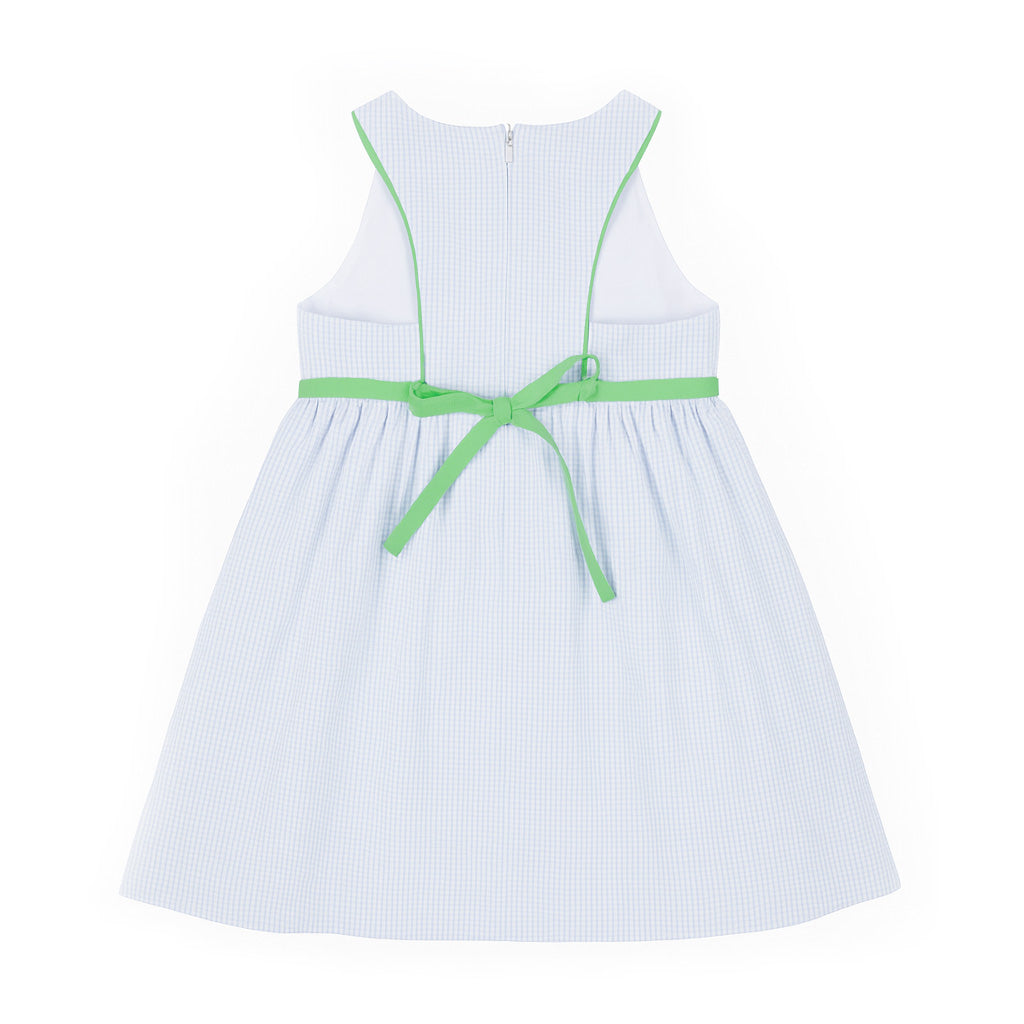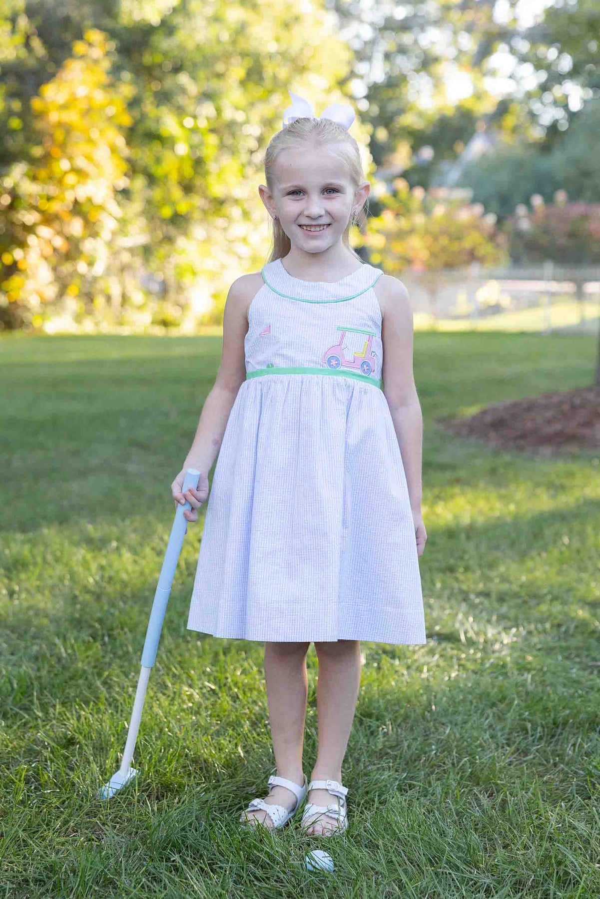 Classic and playful, this dress is crafted from blue and white check seersucker in soft, breathable 100% cotton—perfect for warm-weather days. A cheerful appliqué golf cart adds a sporty touch, while green spaghetti cording and back waist ties bring a pop of color and a charming finish.
