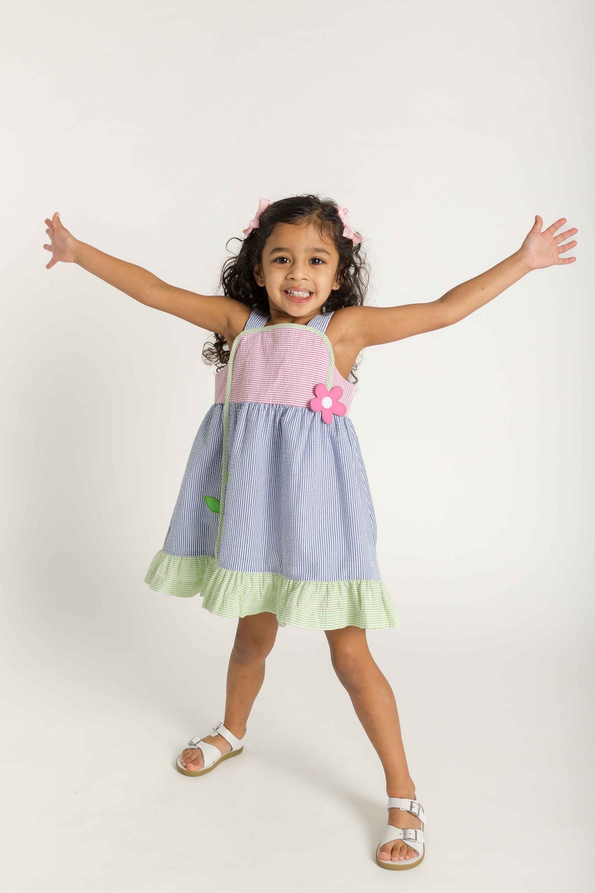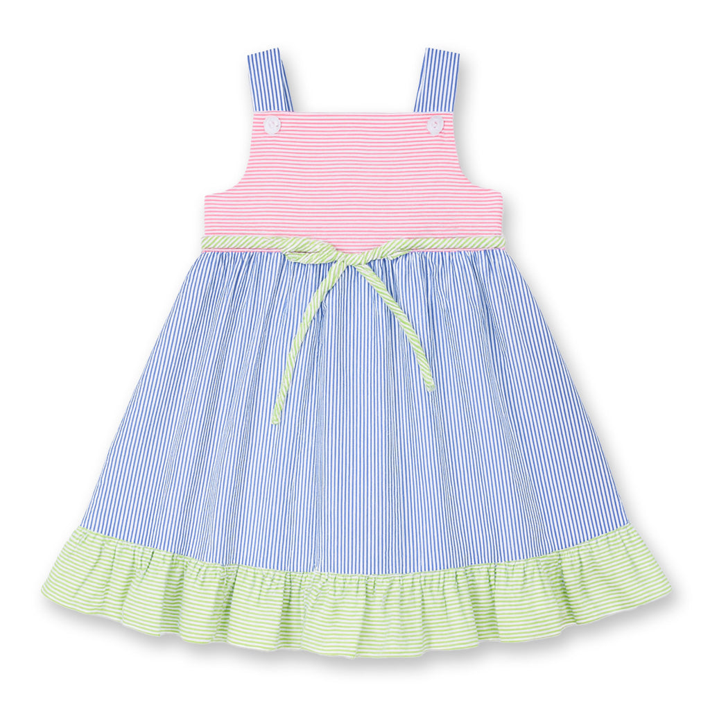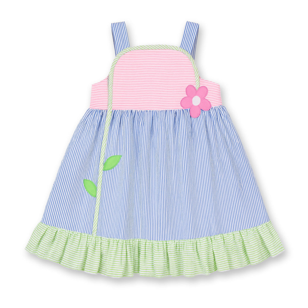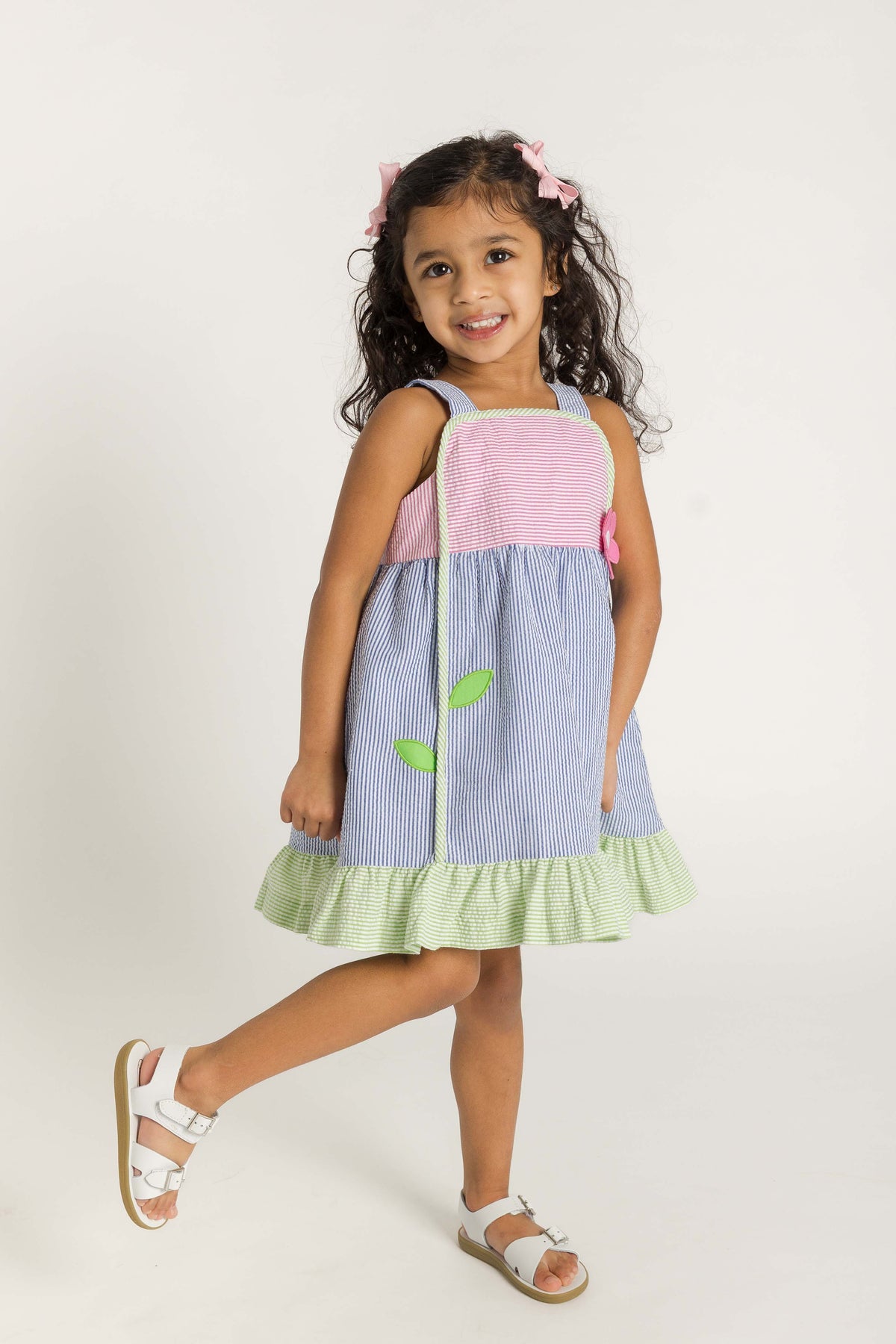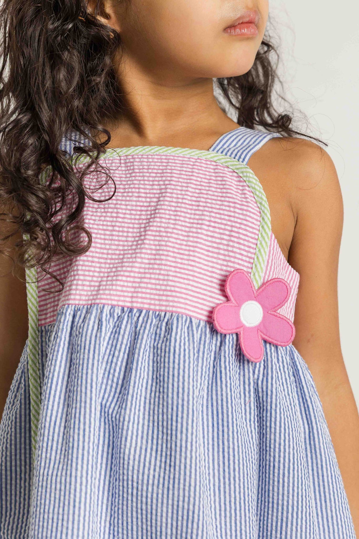Regular price $112.00Bold, colorful, and made for sunshine, this vintage-inspired dress is crafted from bright pink, royal, and lime stripe seersucker for a lightweight, breezy feel perfect for warm-weather getaways. A cheerful bright pink appliqué flower pops against lime stripe binding, adding playful contrast and standout charm.