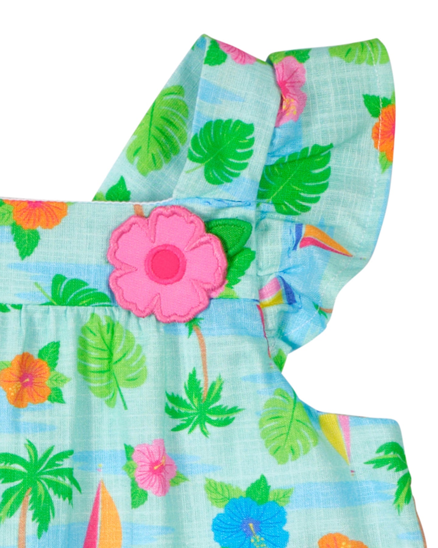 Bright and breezy, this dress is crafted from tropical print linen-look woven in soft, breathable 100% cotton—perfect for warm-weather getaways. A vibrant pink appliqué hibiscus flower blooms at the front yoke, while ruffled shoulders and a hem ruffle add playful movement and charm.