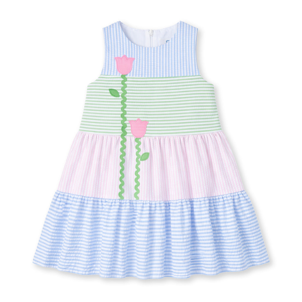 Regular price $112.00Light and joyful, this dress is crafted from pastel pink, blue, and green stripe seersucker for a breezy, warm-weather feel. Appliqué tulips bloom across the bodice with green ric rac stems, adding playful color and charming detail.