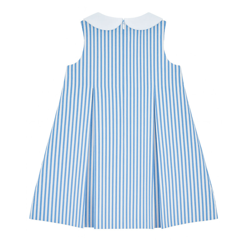 Regular price $112.00Light and classic, this royal and white stripe seersucker dress is crafted from soft 100% cotton for breezy comfort. A crisp white finewale pique collar adds a polished finish, while delicate spaghetti ties with loose flower appliqués lend a playful, handmade touch.