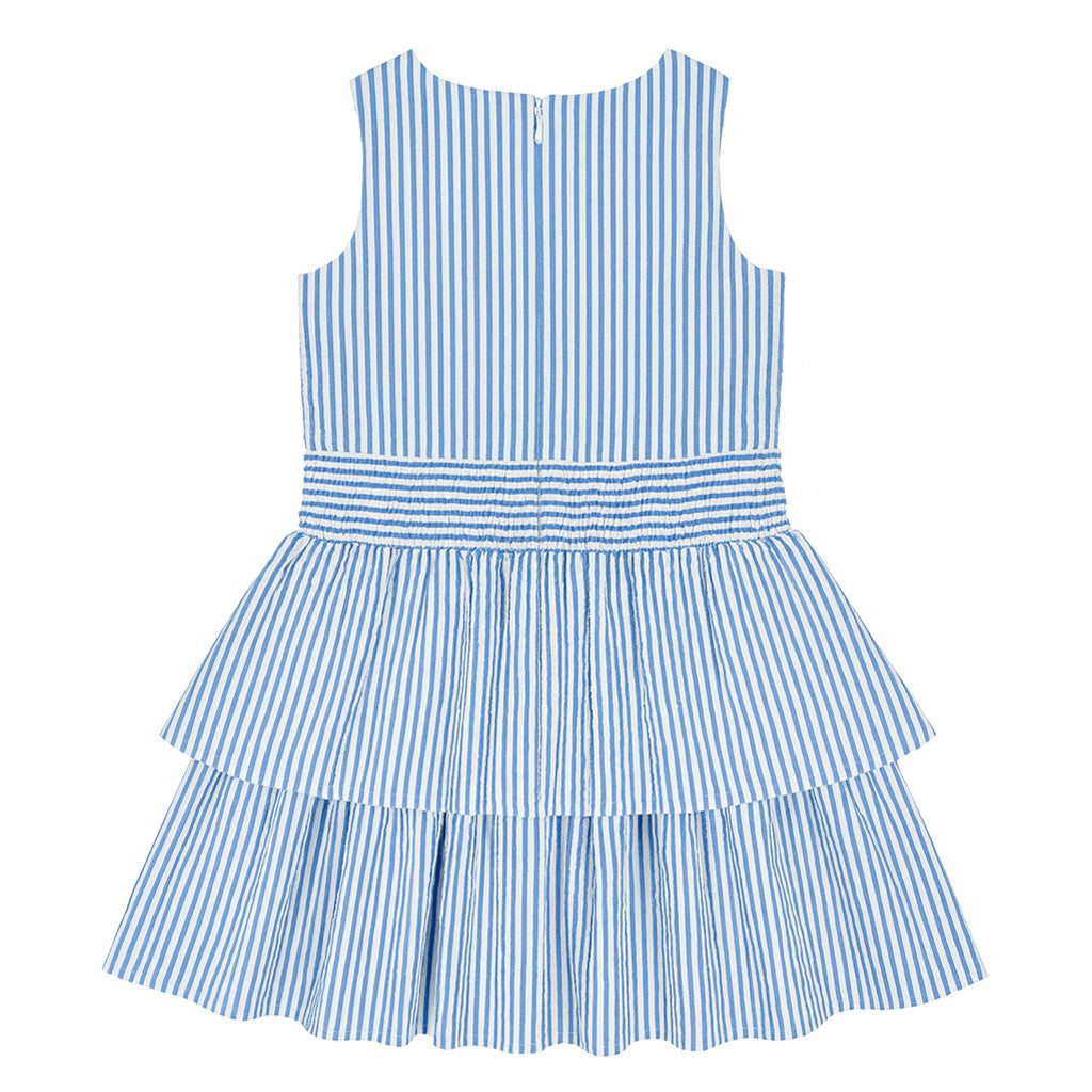 Classic and carefree, this dress is crafted from blue and white stripe seersucker in soft, breathable 100% cotton. Gentle ruching at the waist adds flattering shape and subtle texture to the timeless silhouette.