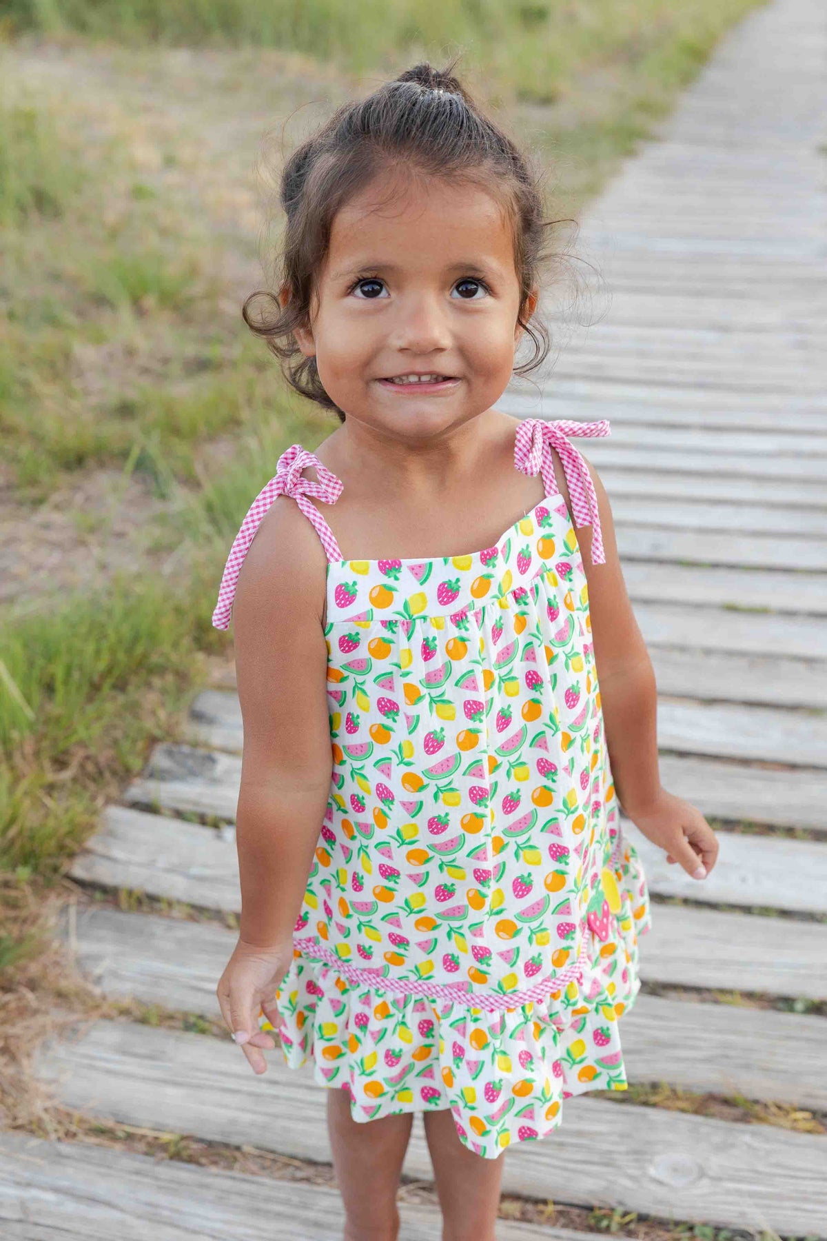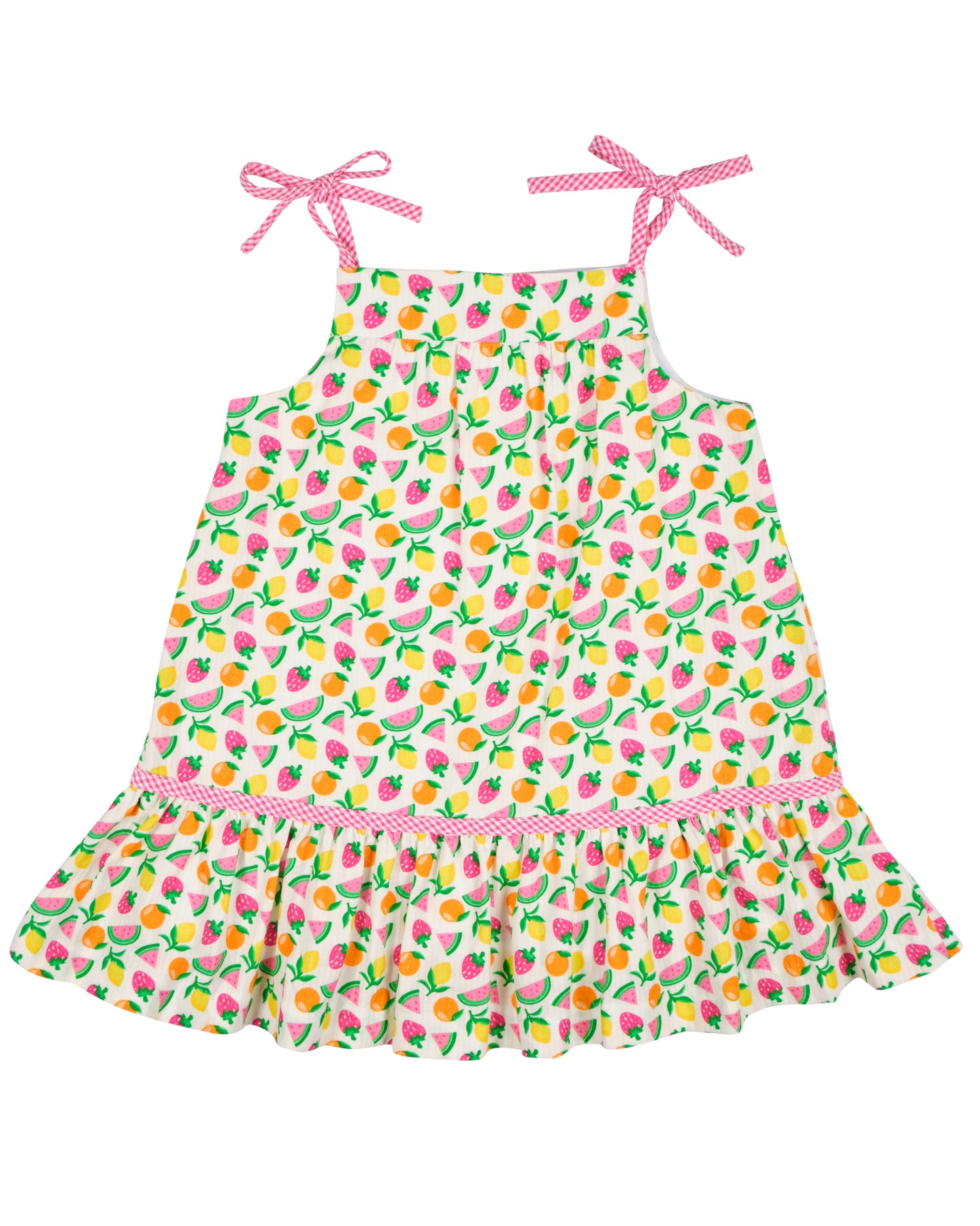Bright and cheerful, this dress is crafted from white seersucker printed with colorful fruit for a fresh, sunny feel. Bright pink check seersucker trim adds a playful pop of contrast, while appliqué strawberry and lemon details bring sweet, summery charm. Shoulder ties give the silhouette an airy, adjustable touch.