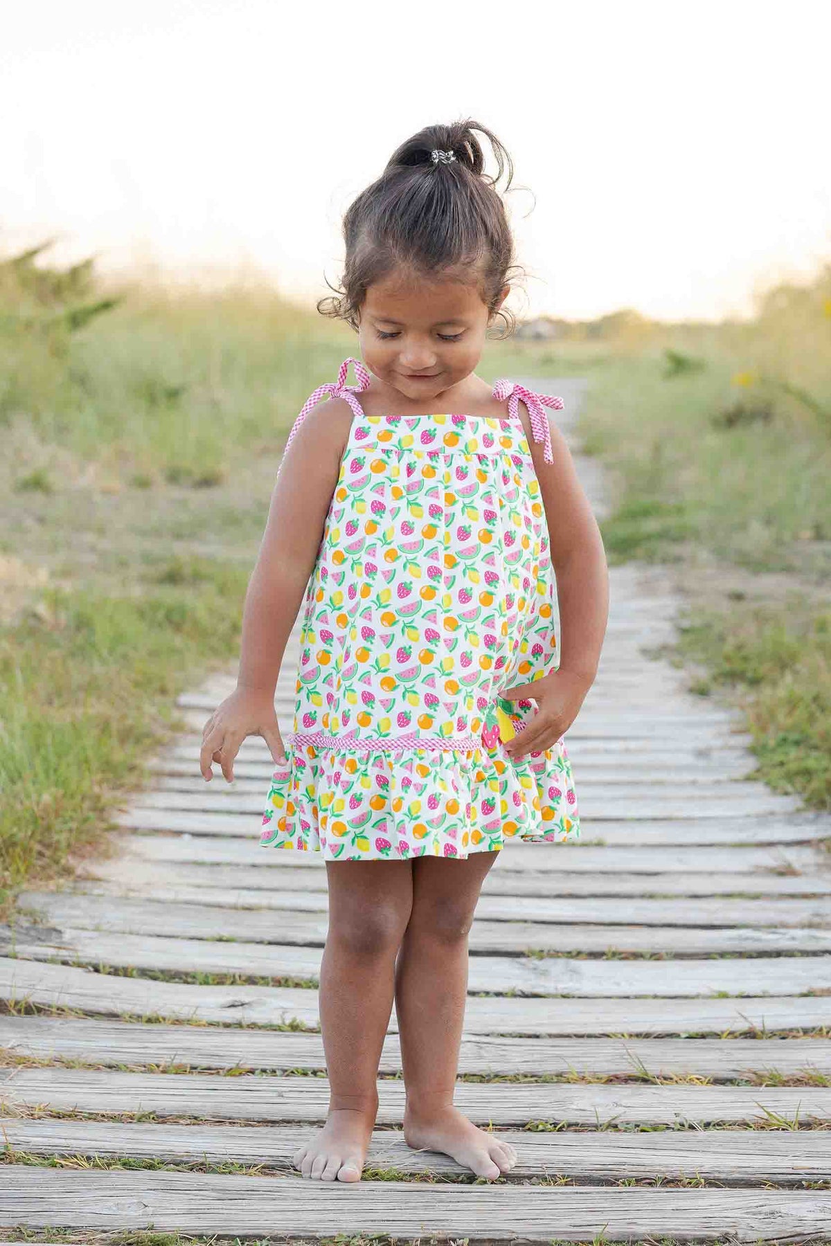 Young girl in a polka dot dress standing on a wooden path with grass and sunset in the background