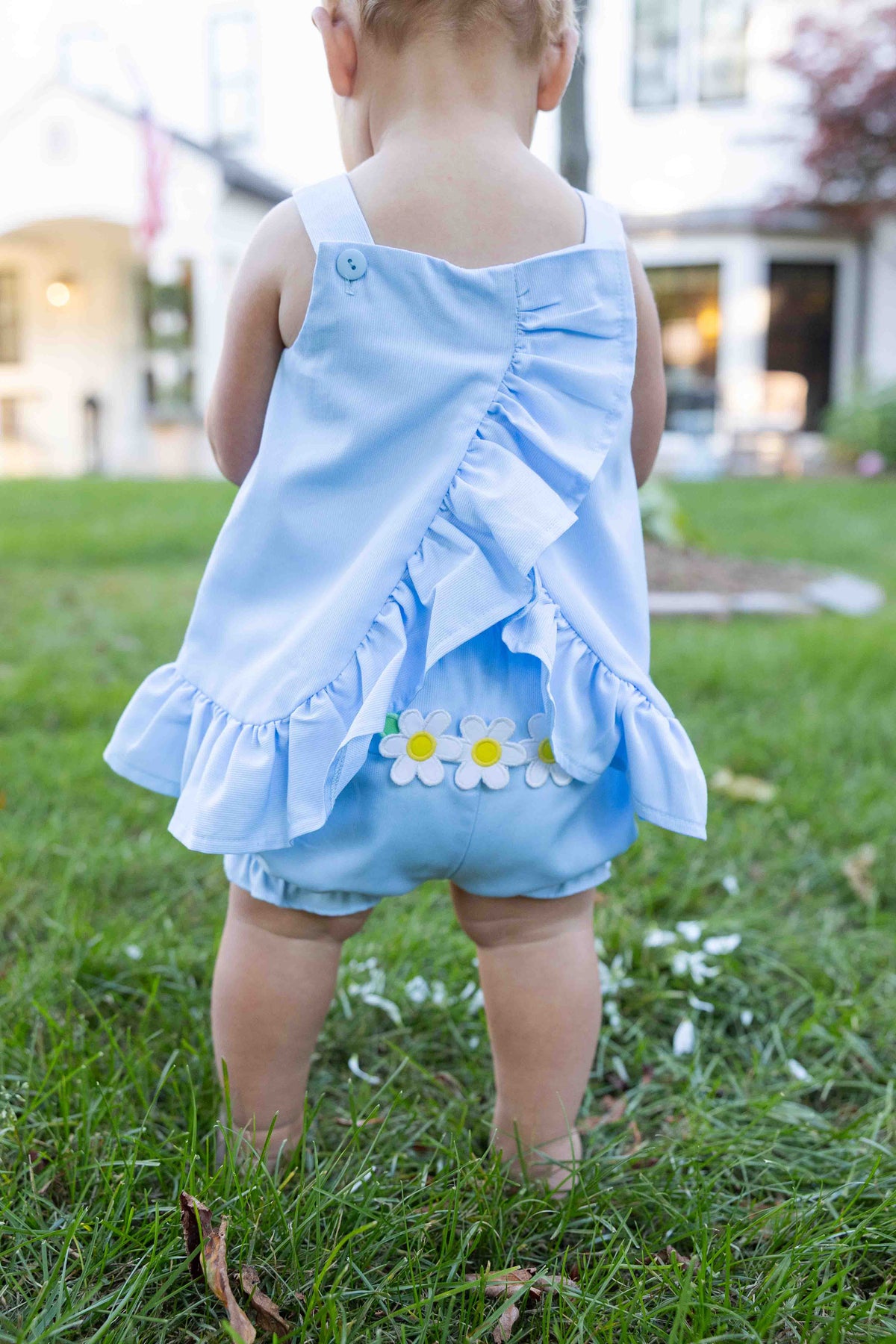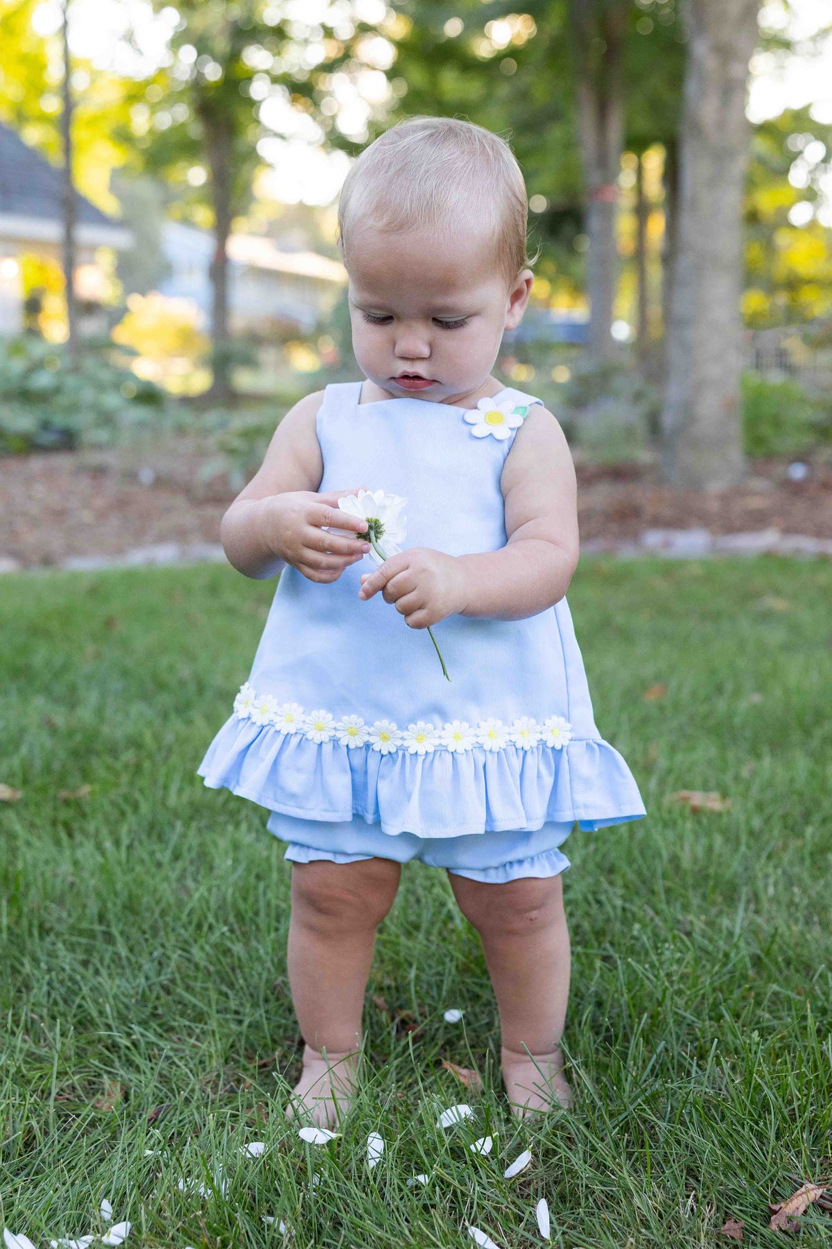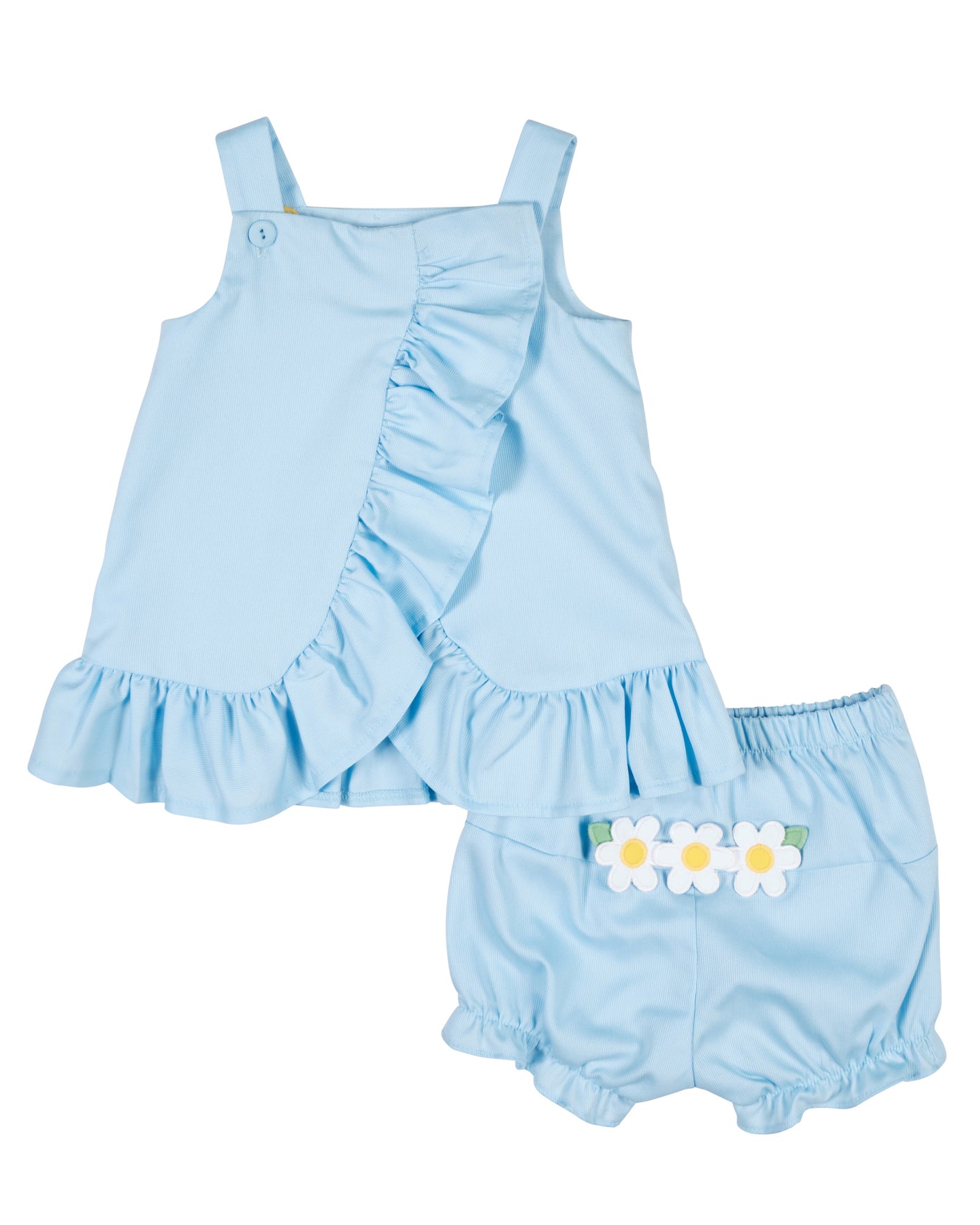 Sweet and thoughtfully detailed, this two-piece set is crafted from light blue finewale piqué in soft, breathable 100% cotton—perfect for springtime celebrations and sunny days. Appliqué daisies bloom at the front shoulder and back seat, adding playful charm from every angle.