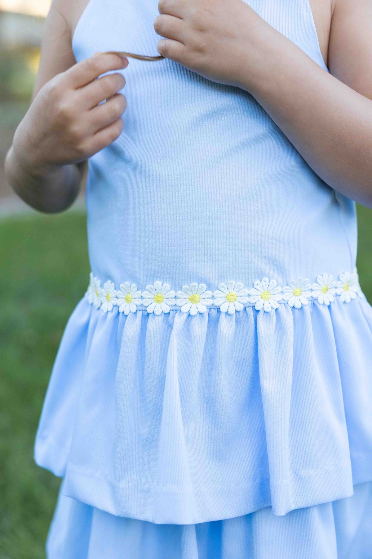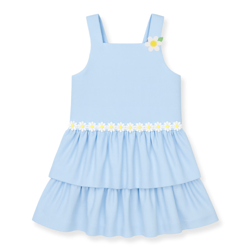 Regular price $112.00Fresh and full of springtime charm, this dress is crafted from light blue finewale piqué in soft, breathable 100% cotton. Appliqué daisies bloom along the shoulder straps, complemented by daisy trim at the waist for a cheerful, polished finish.