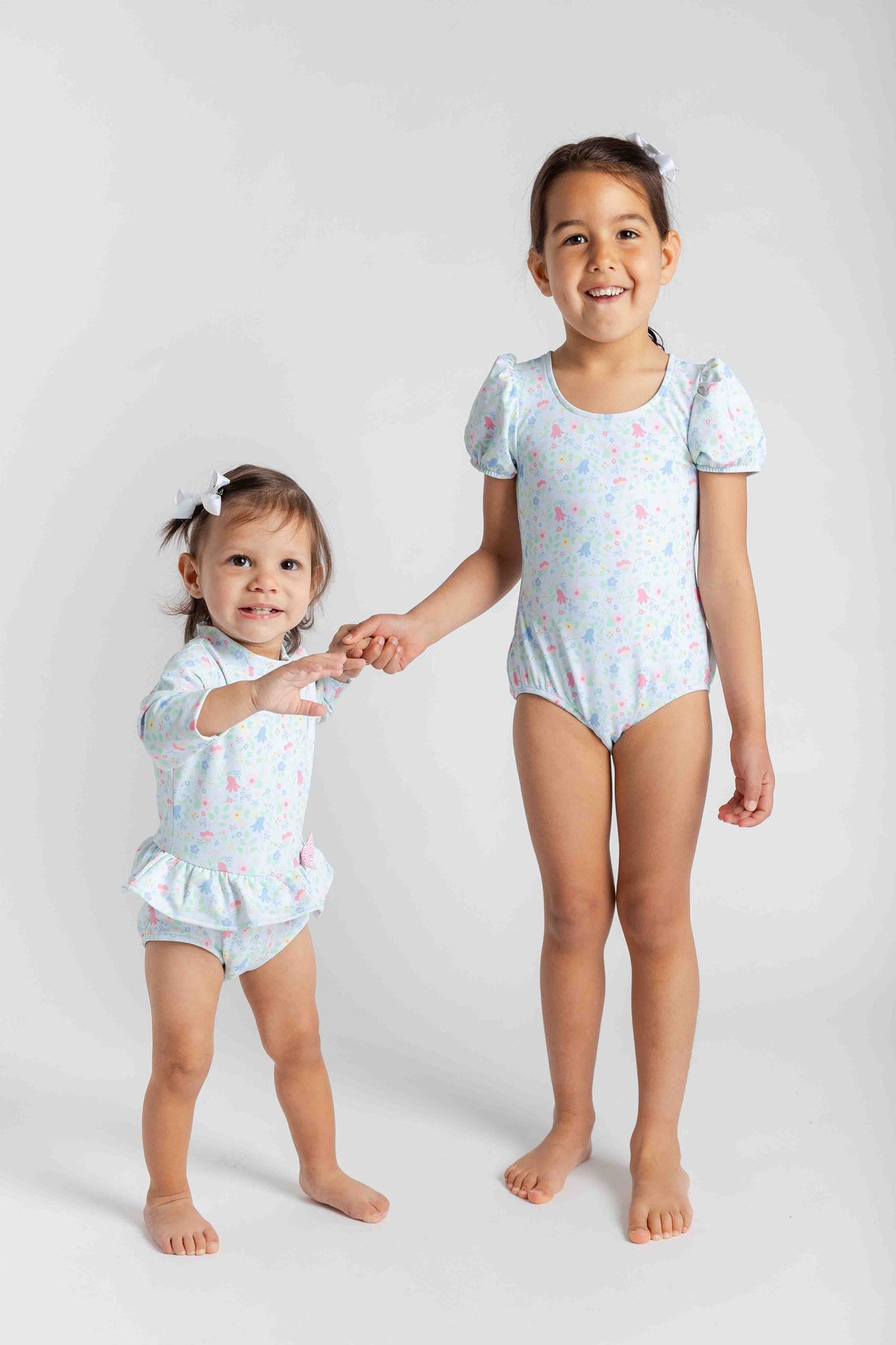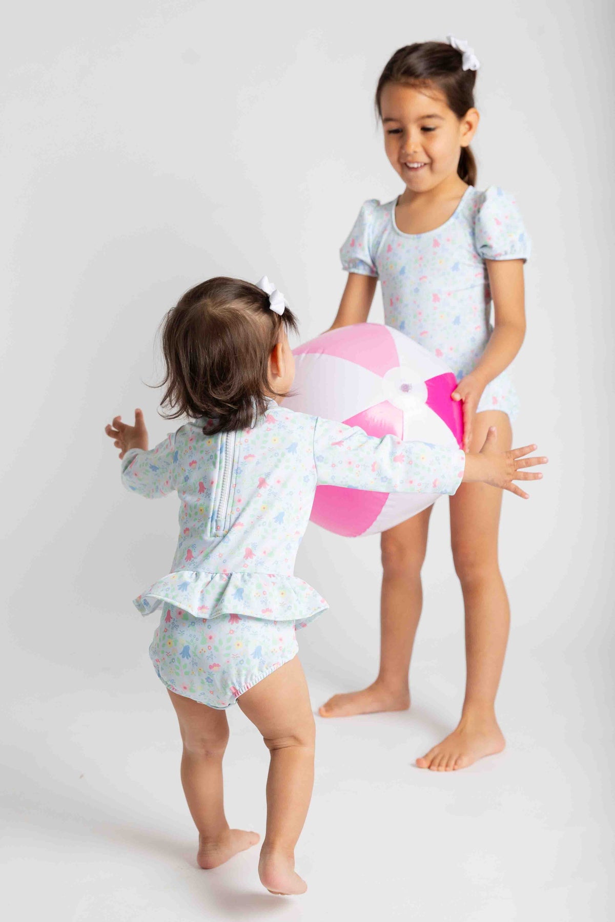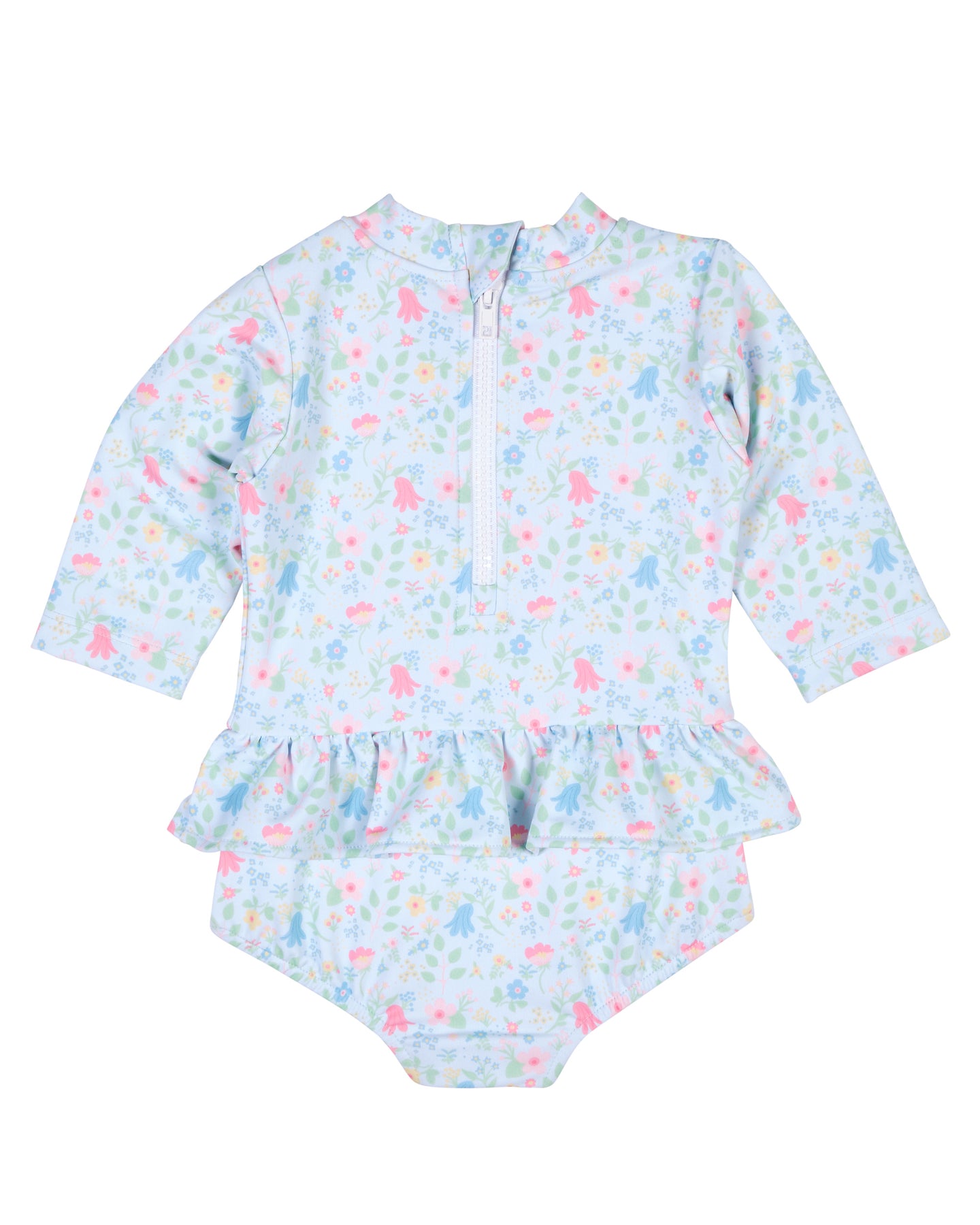 Regular price $108.00Bright, colorful, and sun-safe, this one-piece rashguard swimsuit is crafted from our custom blue and multicolor floral print on a soft, stretchy nylon-spandex blend. A bold stripe bow at the back adds a playful, picture-perfect touch, while a back zipper makes dressing easy.