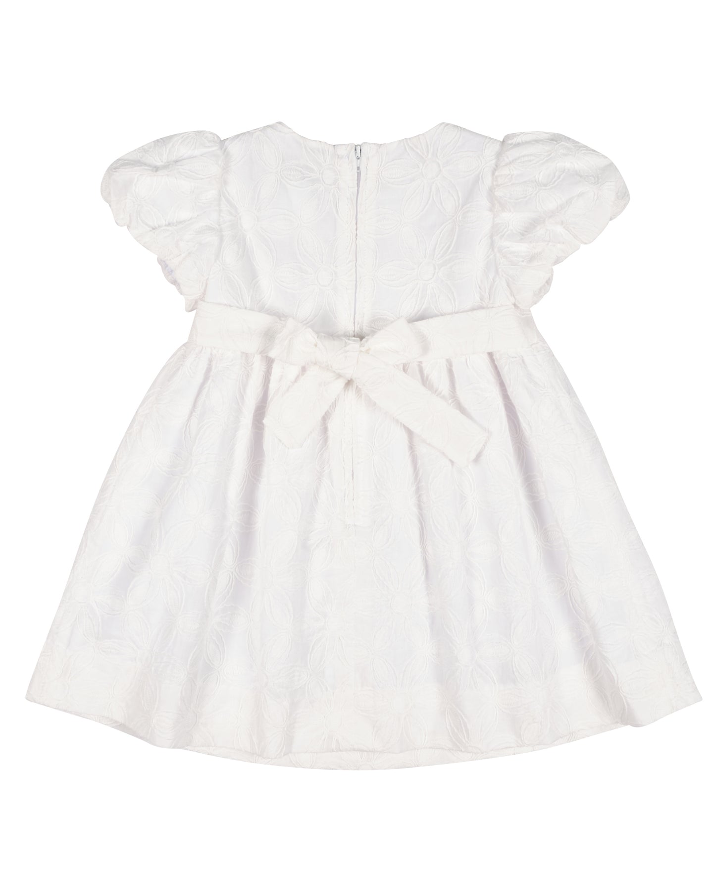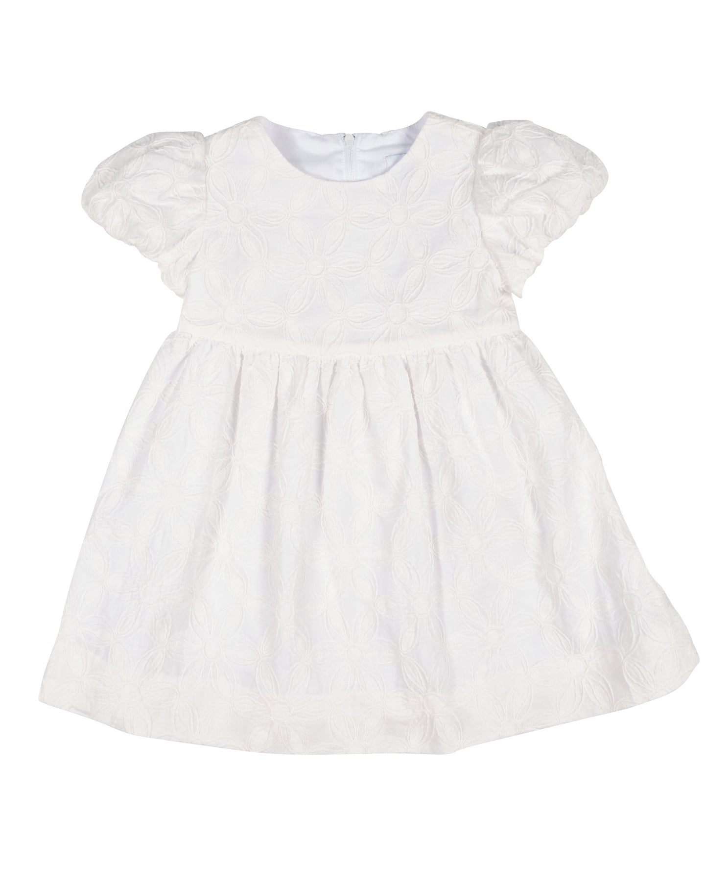 Fresh and feminine, this dress is crafted from crisp white poplin embroidered with delicate floral details for a timeless, warm-weather look. Soft bubble sleeves add a touch of volume, while the waist dress silhouette with a shirred skirt creates graceful movement that feels perfect for sunny days away.