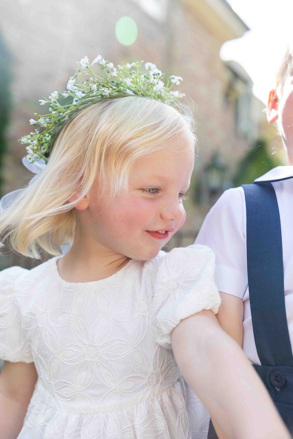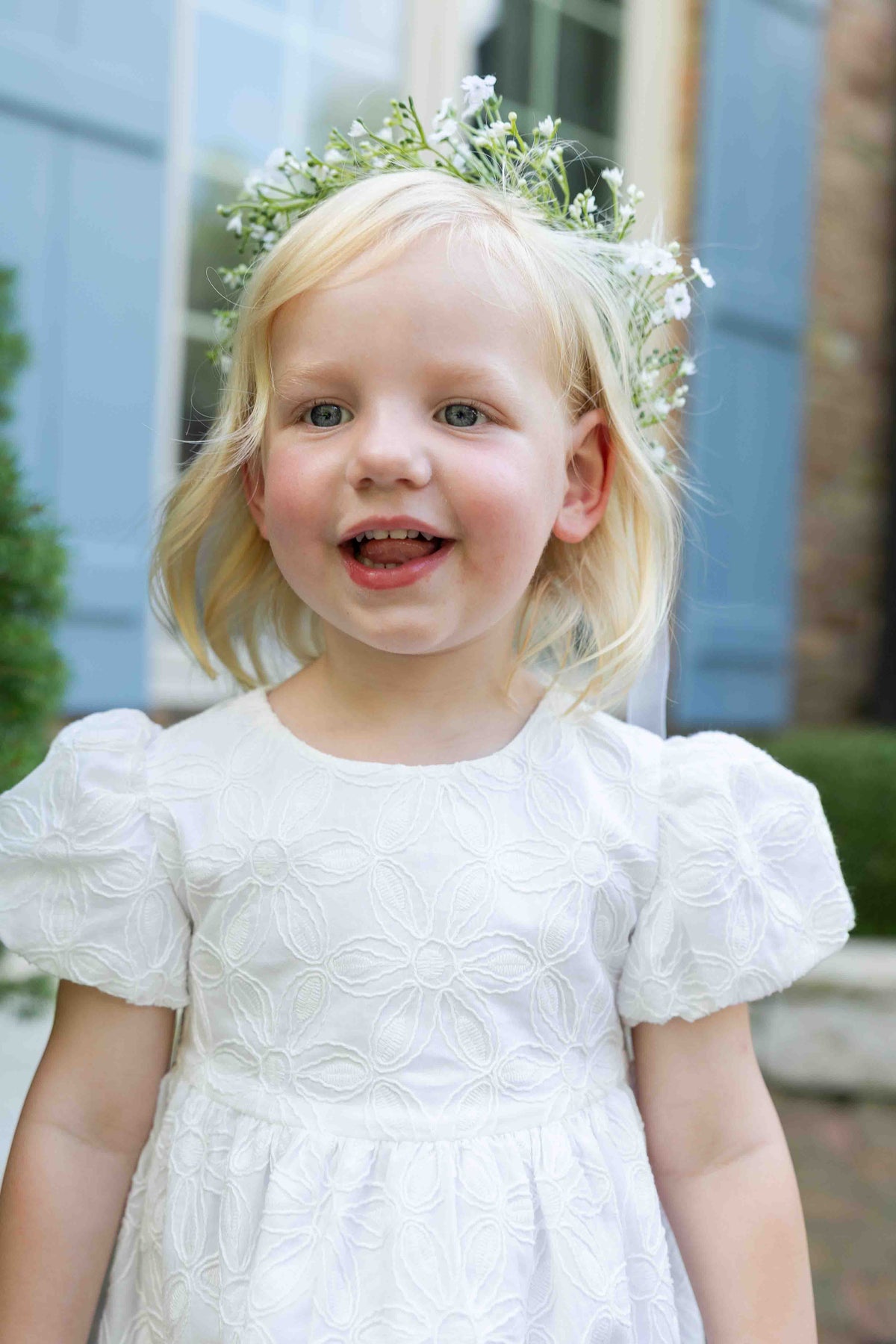 Young girl in a white dress standing outdoors with greenery and a building in the background