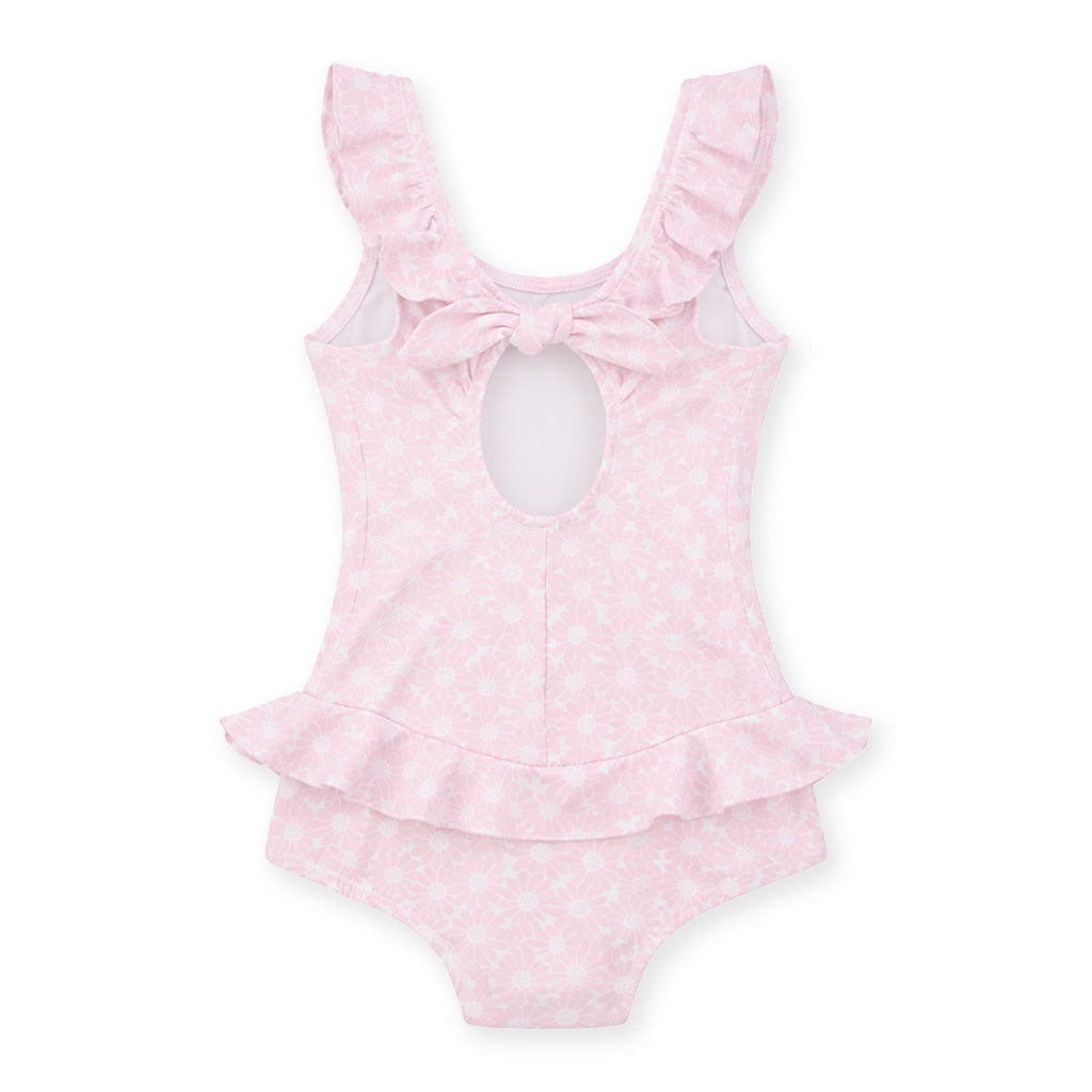A soft pink and white floral print brings a fresh, cheerful feel to this swimsuit, perfect for sunny days and warm-weather fun. Flared ruffles at the neckline and hips add a playful, polished touch.