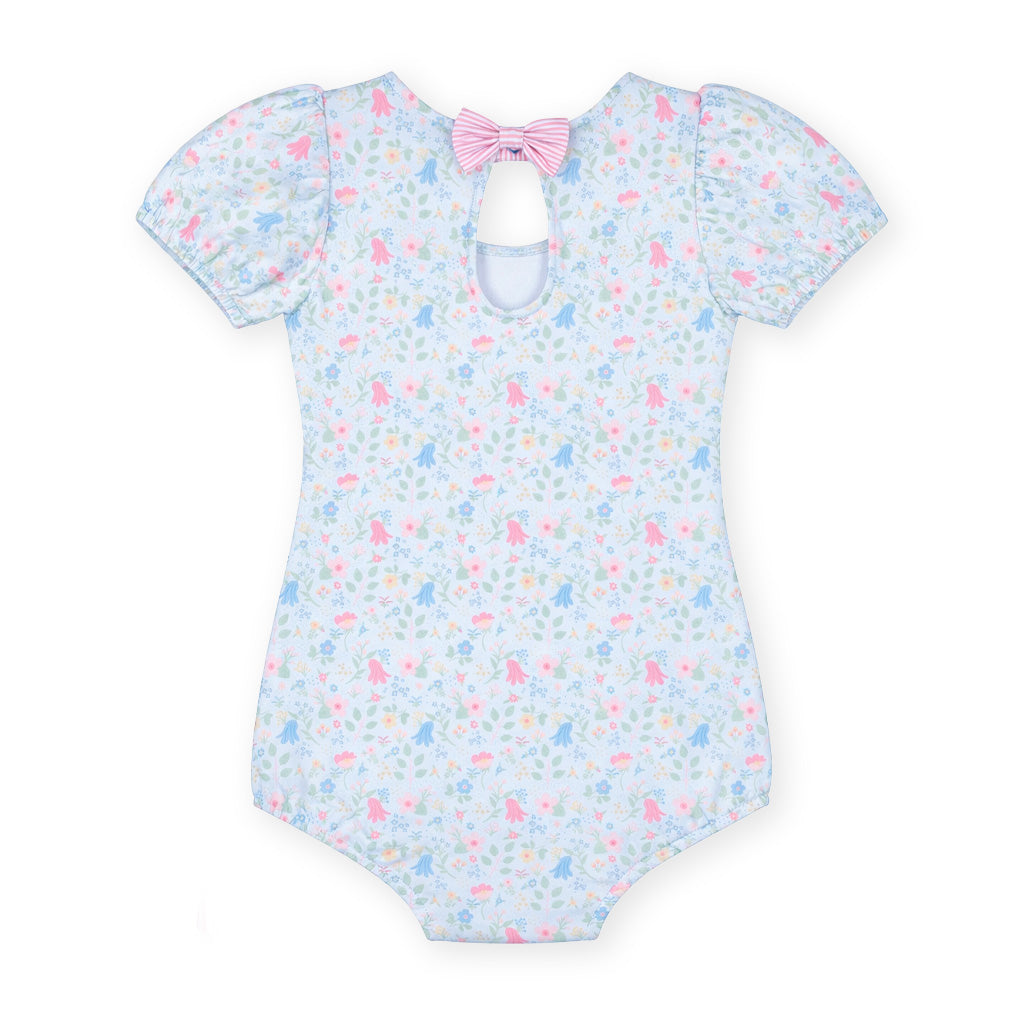 Regular price $108.00Sweet, sunny, and full of charm, this swimsuit is crafted from our custom blue and multicolor floral print on a soft, stretchy nylon-spandex blend. Puff sleeves add a playful, vintage-inspired touch, while a striped bow at the back—secured with a snap—makes for a picture-perfect finish.