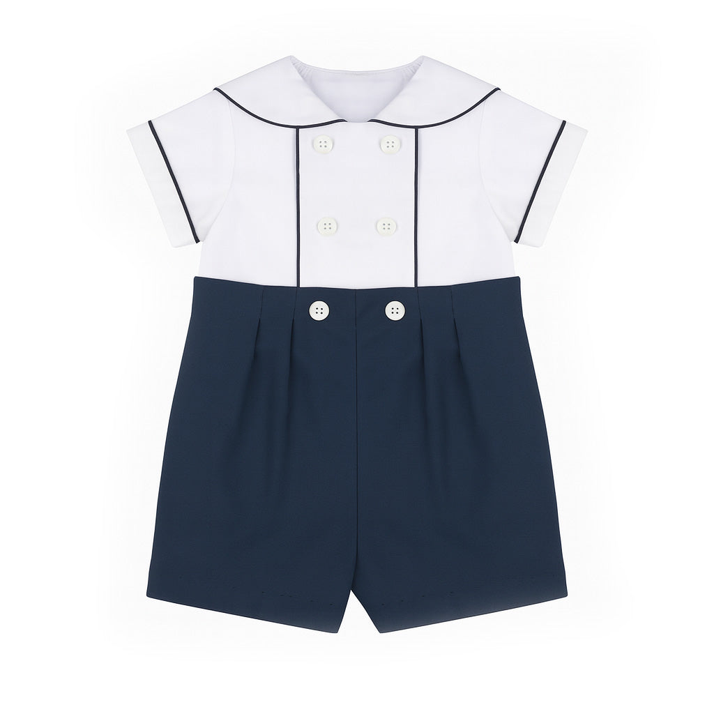 Regular price $96.00This navy button-on suit is a classic Florence Eiseman through and through. With fabric imported from Brazil, navy piping on the sleeves, front placket, and sailor collar. The navy shorts are fully lined with a snap crotch and button onto the shirt for a neat, clean look at all times. Your little guy will look like a little prince all day long!