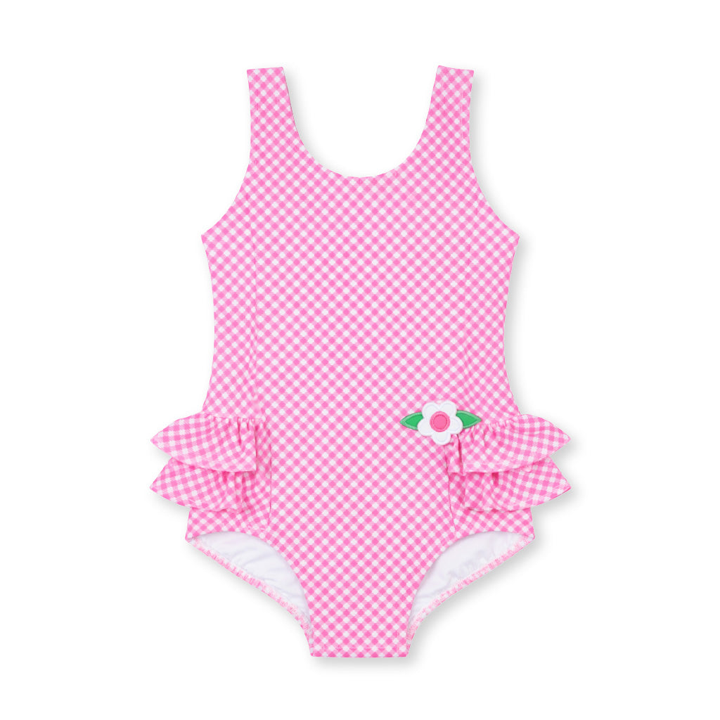 Regular price $100.00Sweet and timeless, this swimsuit features a classic pink and white gingham print on soft, stretchy tricot made with recycled fibers. Princess seams finished with delicate ruffles add a charming, feminine touch, while appliqué flowers bring cheerful detail to the front.