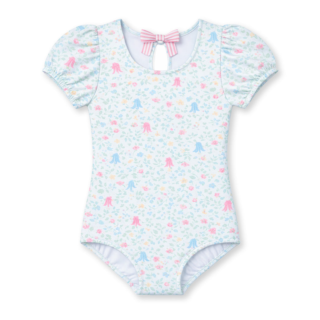 Regular price $108.00Sweet, sunny, and full of charm, this swimsuit is crafted from our custom blue and multicolor floral print on a soft, stretchy nylon-spandex blend. Puff sleeves add a playful, vintage-inspired touch, while a striped bow at the back—secured with a snap—makes for a picture-perfect finish.