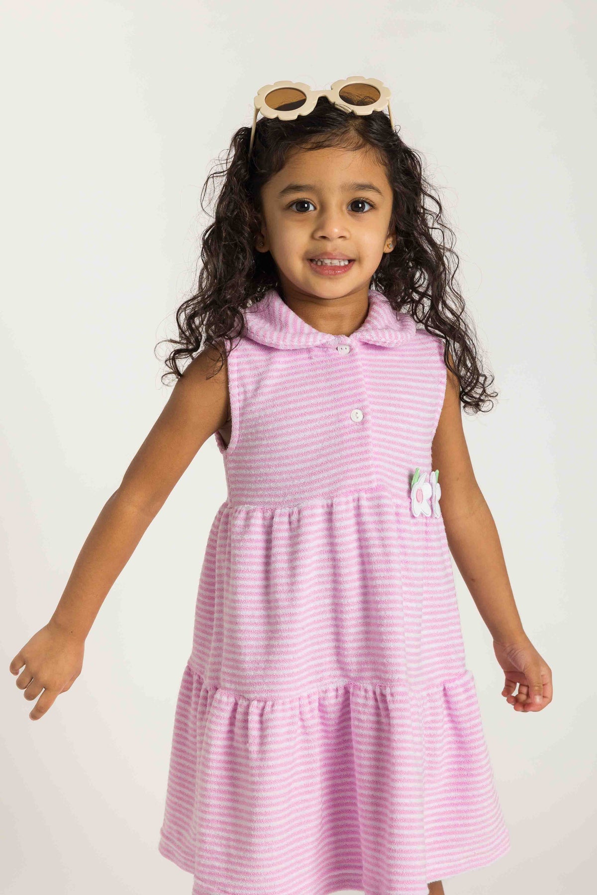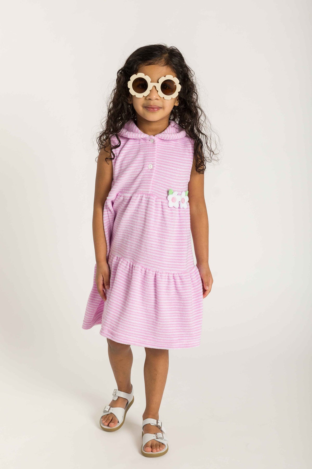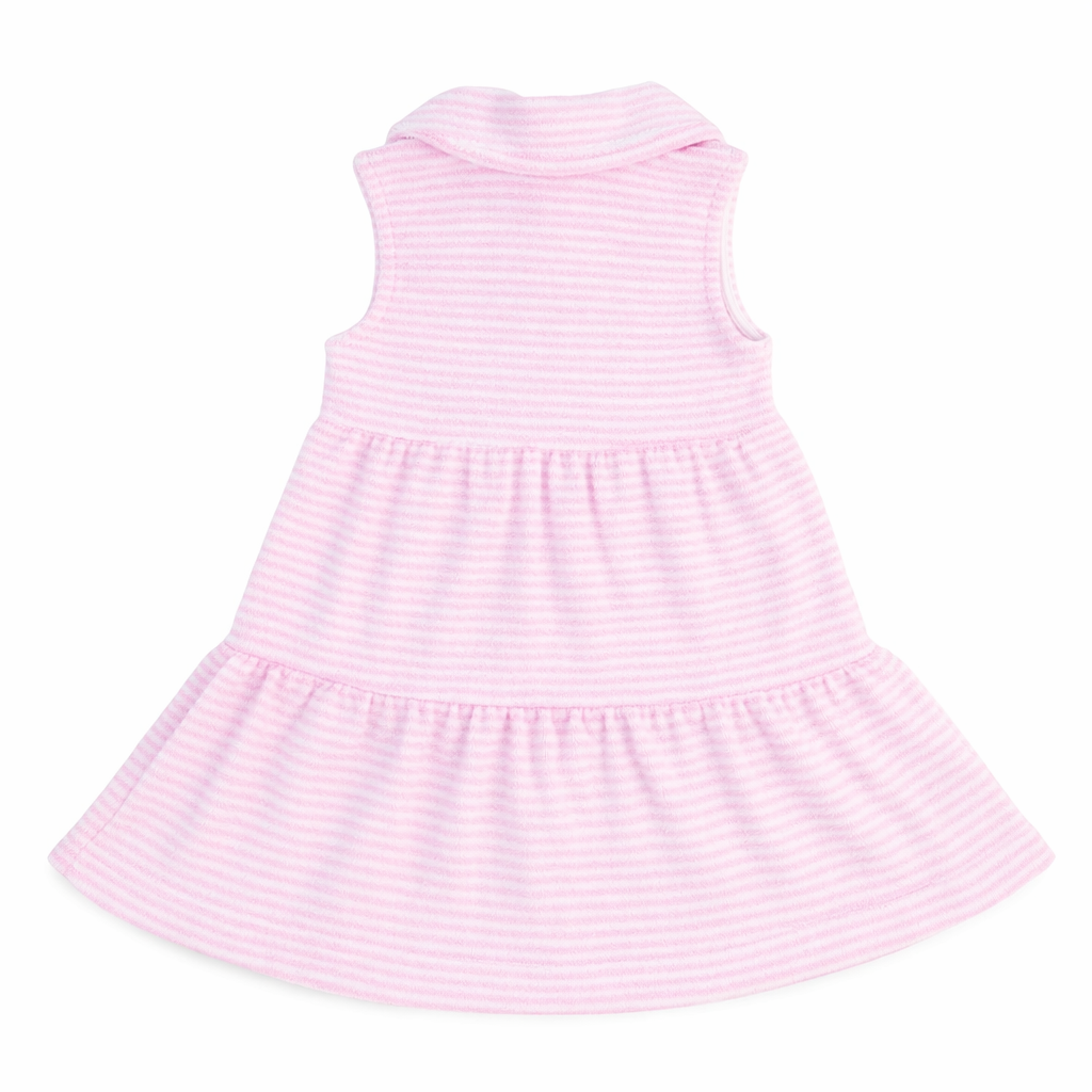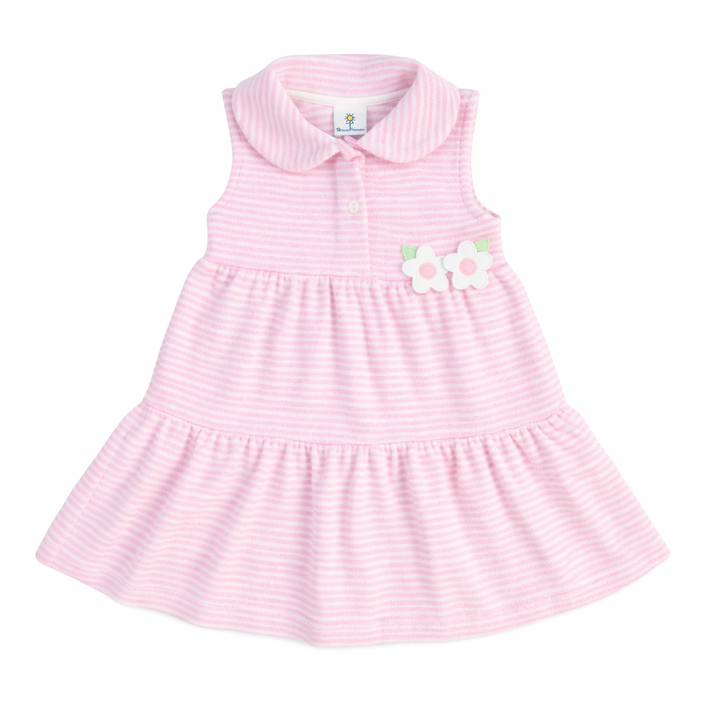 Regular price $88.00Designed for easy transitions from pool to play, this dress is crafted from soft pink and white stripe terry cloth that slips comfortably over a swimsuit. Cheerful appliqué flowers add a sweet touch, while the front button placket gives it a classic, polished finish.