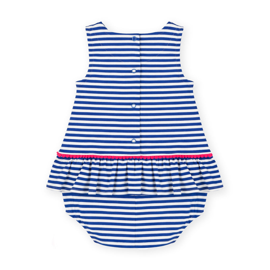 Regular price $88.00Full of color and charm, this romper is crafted from royal and white yarn-dyed stripe interlock knit for soft, durable comfort. Fuchsia, green, and yellow mini pom-pom trim adds a playful pop of texture, while bright appliqué flowers bring cheerful vacation-ready detail.