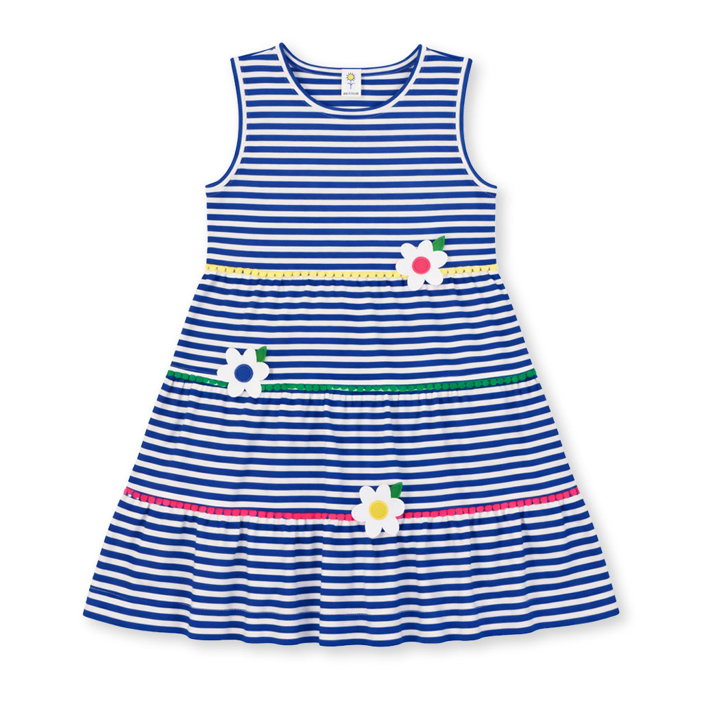Regular price $92.00Bright, playful, and full of texture, this dress is crafted from royal and white yarn-dyed stripe interlock knit for soft, all-day comfort. Fuchsia, green, and yellow mini pom-pom trim adds cheerful color, while appliqué flowers bloom across the bodice for a sweet, summery touch.