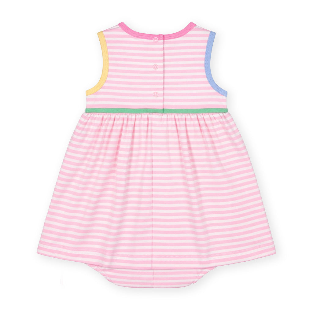 Regular price $88.00Bright, sweet, and ready for sunny play, this romper is crafted from pink and white yarn-dyed stripe interlock knit for soft, all-day comfort. Pink, blue, and yellow appliqué flowers bloom across the front, while multicolor trim at the neck, armholes, and waist adds a cheerful pop of color.