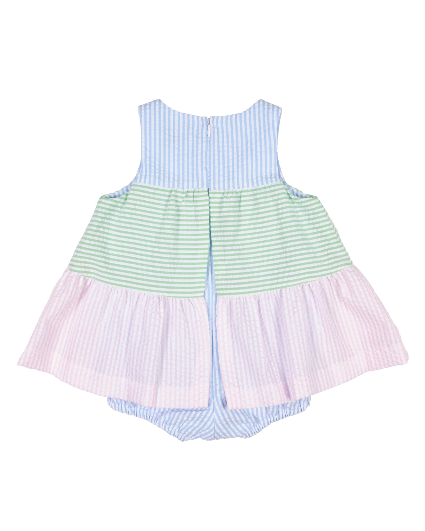 Fresh and playful, this romper is crafted from pastel pink, blue, and green stripe seersucker for a light, breezy feel perfect for warm-weather days. Appliqué tulips bloom across the front with green ric rac stems, adding cheerful color and charming detail.