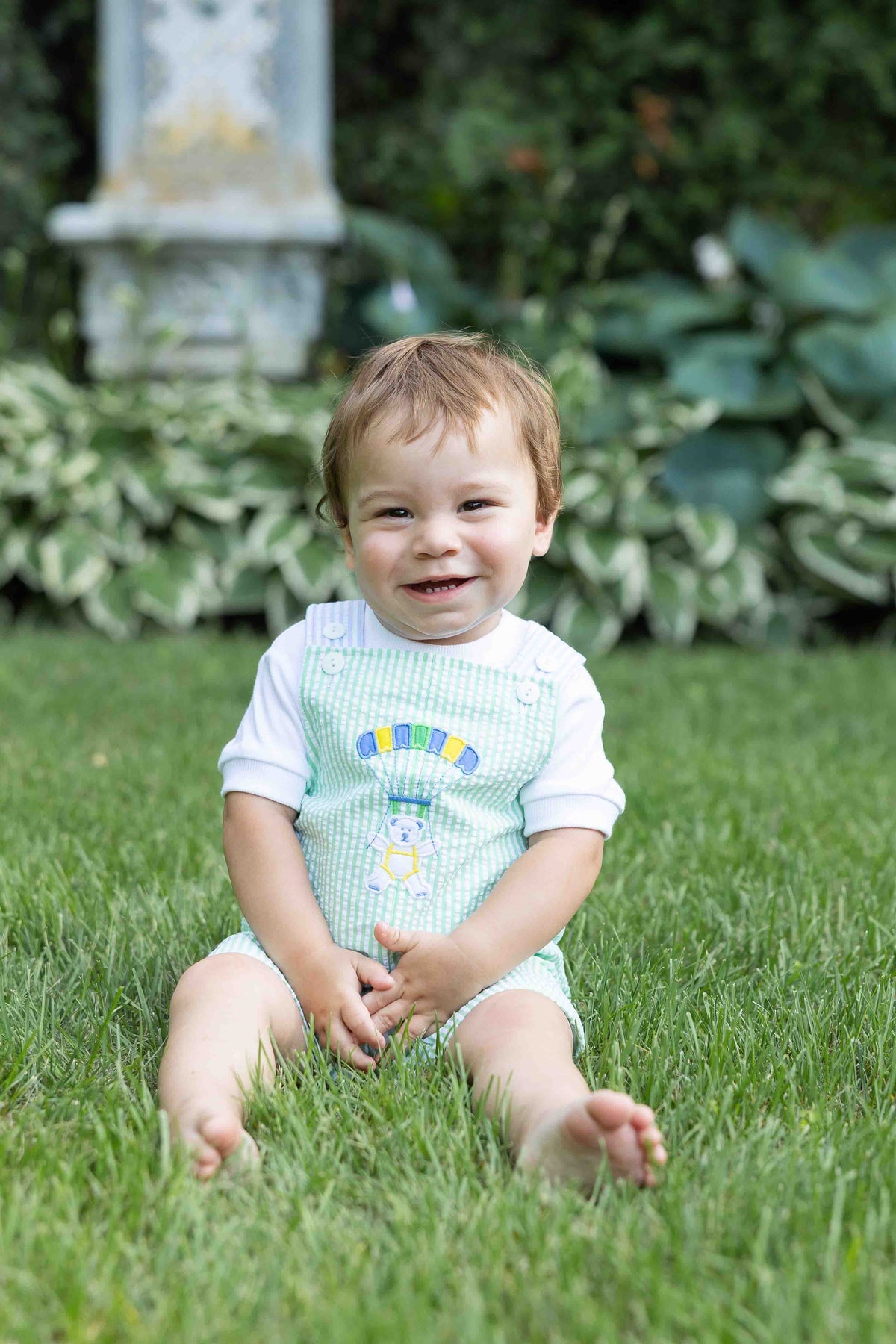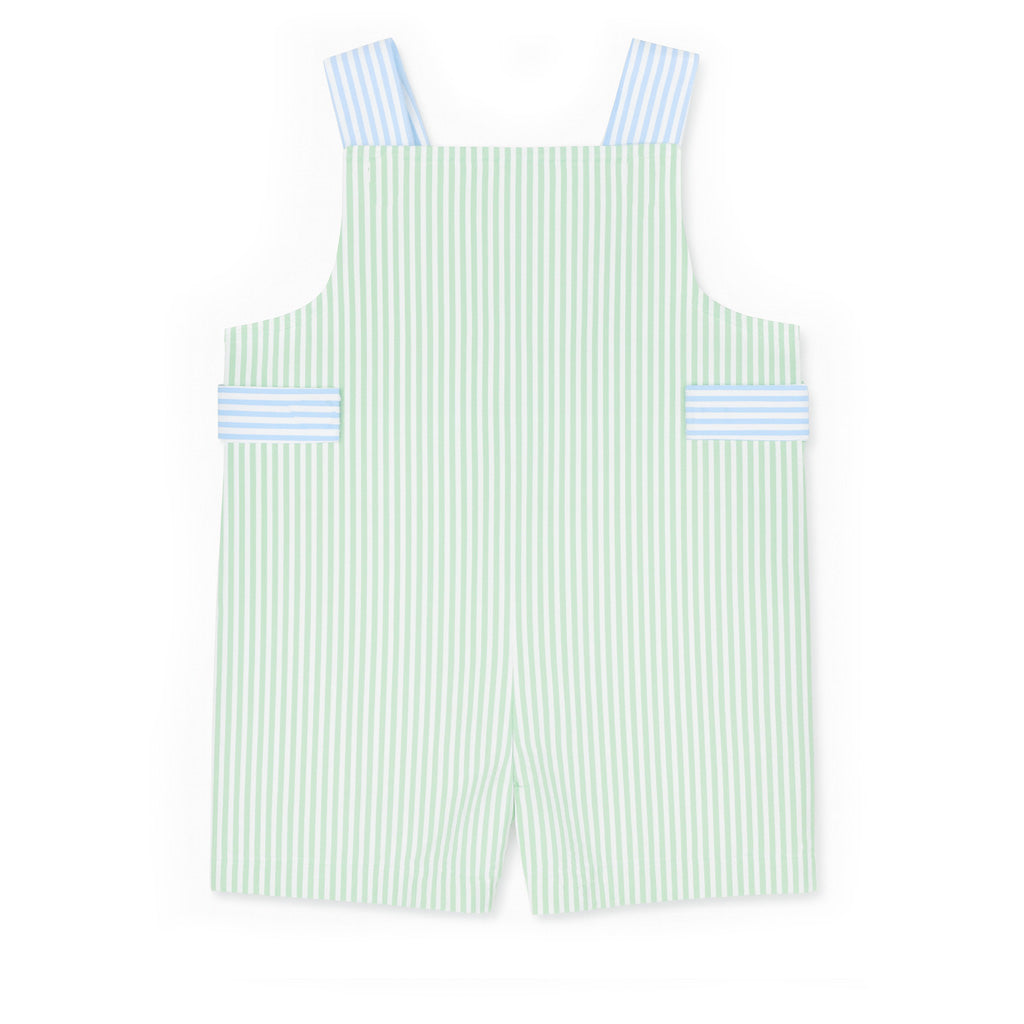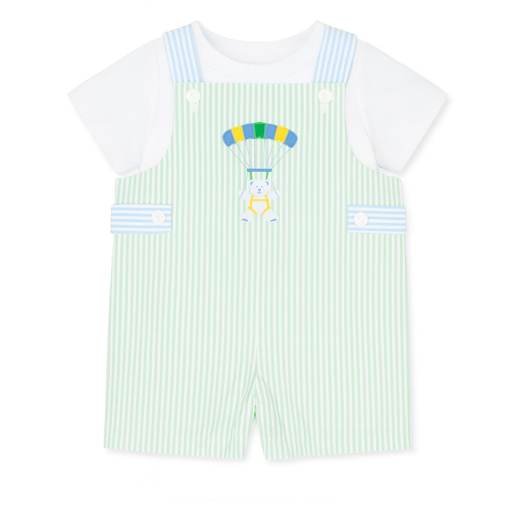 Regular price $96.00Playful and perfectly suited for warm-weather adventures, this shortall is crafted from pastel green and white stripe seersucker with coordinating pastel blue and white stripe trim. A charming appliqué bear floating down by parachute adds a touch of whimsy that feels right at home on vacation days.