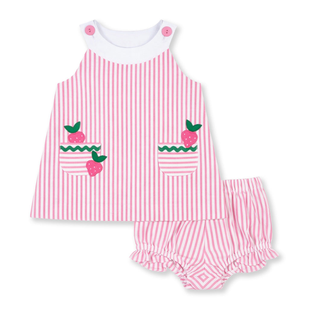 Regular price $104.00Sweet and full of summertime charm, this two-piece set is crafted from pink and white stripe seersucker in soft, breathable 100% cotton. Appliqué strawberries add a cheerful pop of color, complemented by playful patch pockets and green ric rac trim for a fresh, garden-inspired finish.