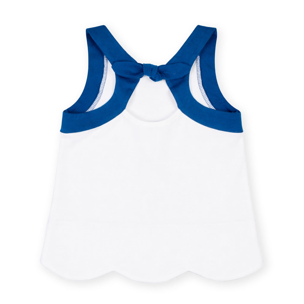 Regular price $64.00Sweet and simple, this white interlock knit top is crafted from soft 100% cotton for everyday comfort. Appliqué flowers bloom along the scallop hem, adding cheerful color and playful charm.