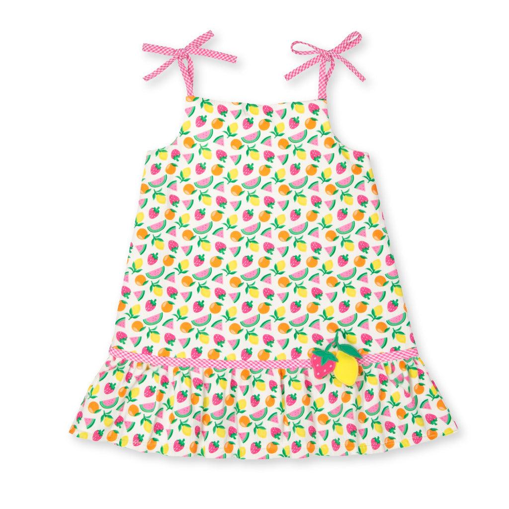 Regular price $112.00Bright and cheerful, this dress is crafted from white seersucker printed with colorful fruit for a fresh, sunny feel. Bright pink check seersucker trim adds a playful pop of contrast, while appliqué strawberry and lemon details bring sweet, summery charm. Shoulder ties give the silhouette an airy, adjustable touch.