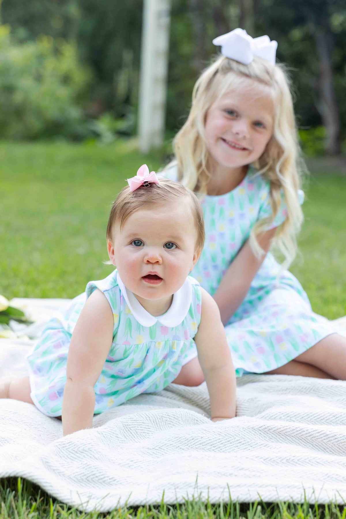 Soft, sweet, and full of spring color, this romper is crafted from pastel blue, yellow, pink, and green tulip print jersey knit with a hint of stretch for all-day comfort. A crisp white Peter Pan collar adds a timeless touch, while the petal-front crossover skirt with white binding creates a charming, dress-like silhouette.