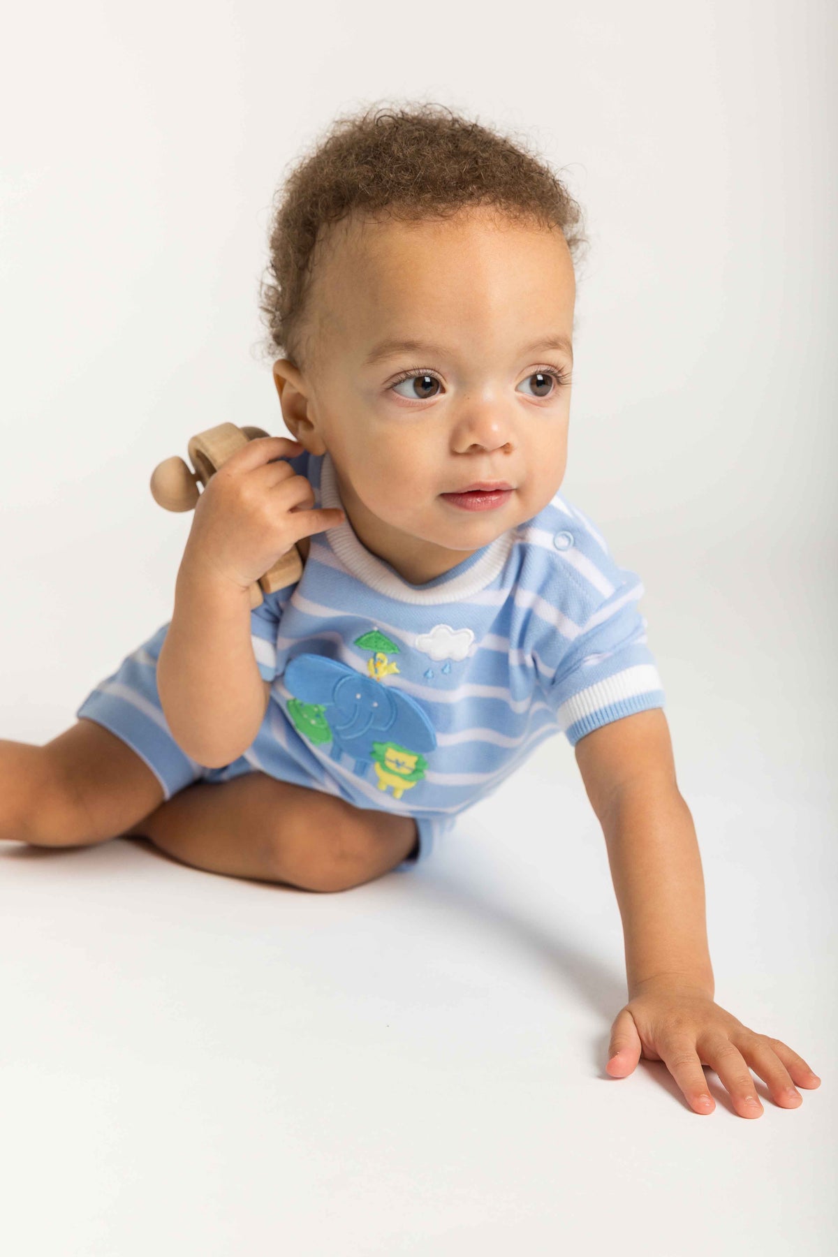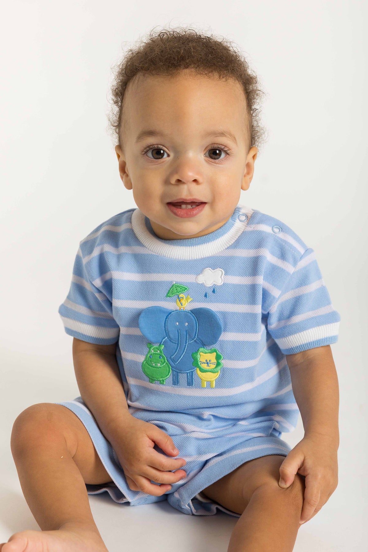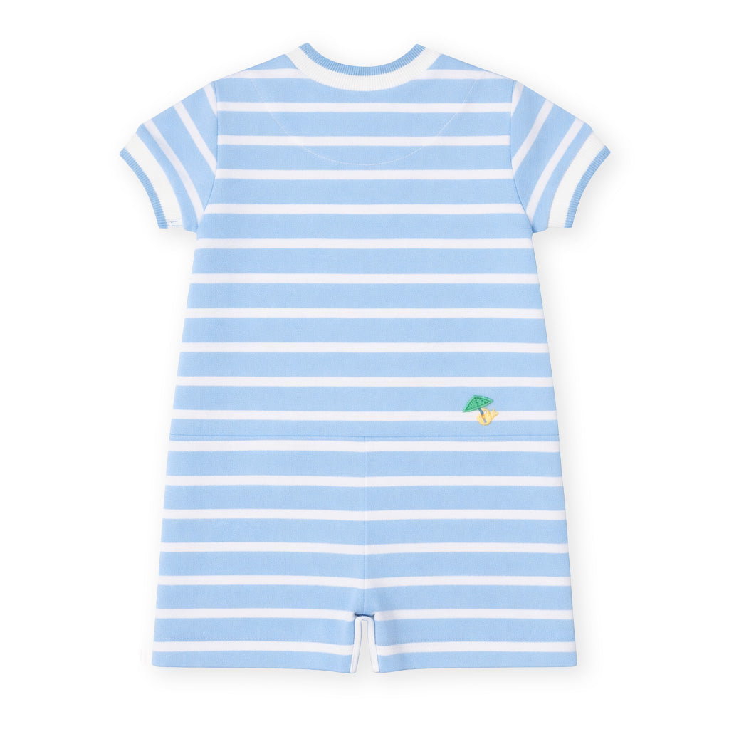 Regular price $88.00Playful and full of personality, this shortall is crafted from light blue and white yarn-dyed stripe piqué knit in soft, breathable 100% cotton—perfect for warm, sunny days. A charming appliqué scene of an elephant, lion, hippo, and bird under a rain cloud decorates the front, while a sweet bird with an umbrella appears on the back seat for an extra surprise detail.