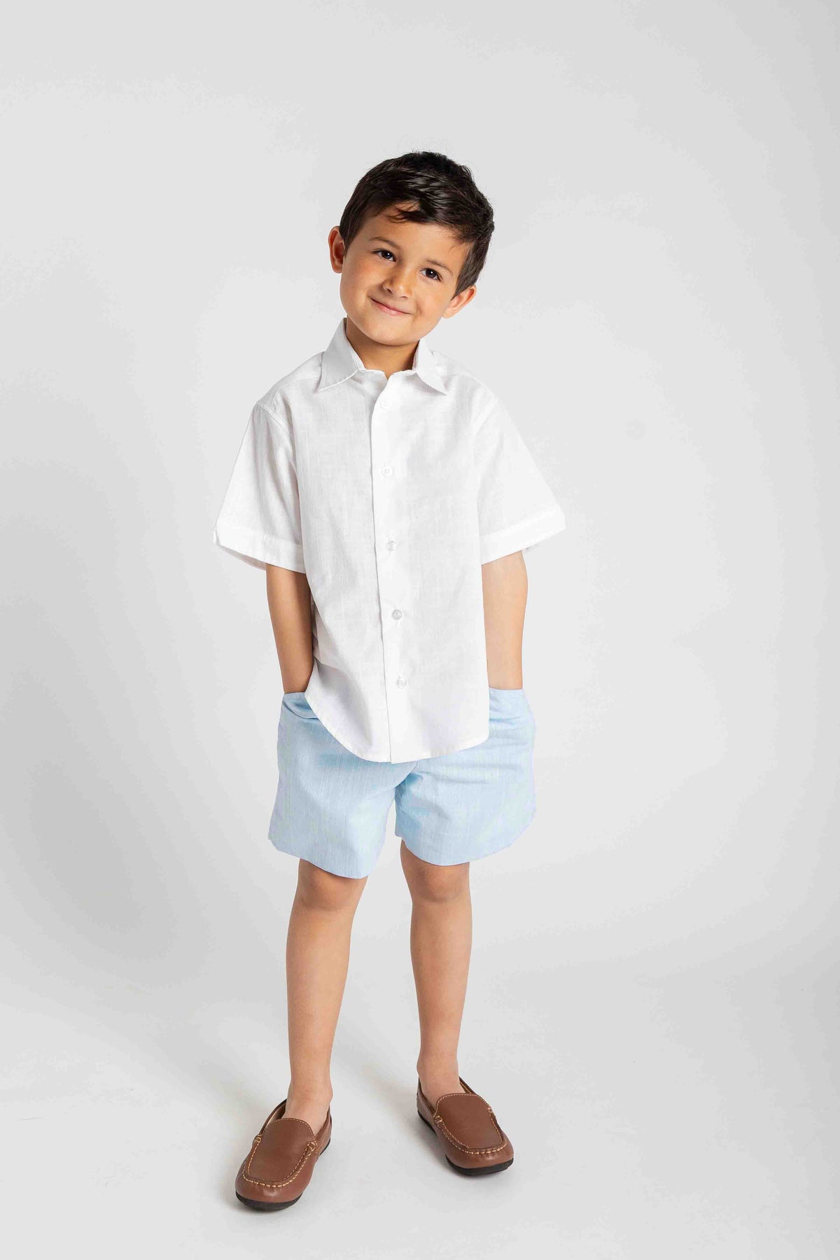 Regular price $76.00Light and polished for warm-weather days, these shorts are crafted from light blue linen-look woven in soft, breathable 100% cotton. Designed with front slant pockets, a neat fake fly, and belt loops, they offer a tailored look with easy, pull-on comfort thanks to a back elastic waistband.