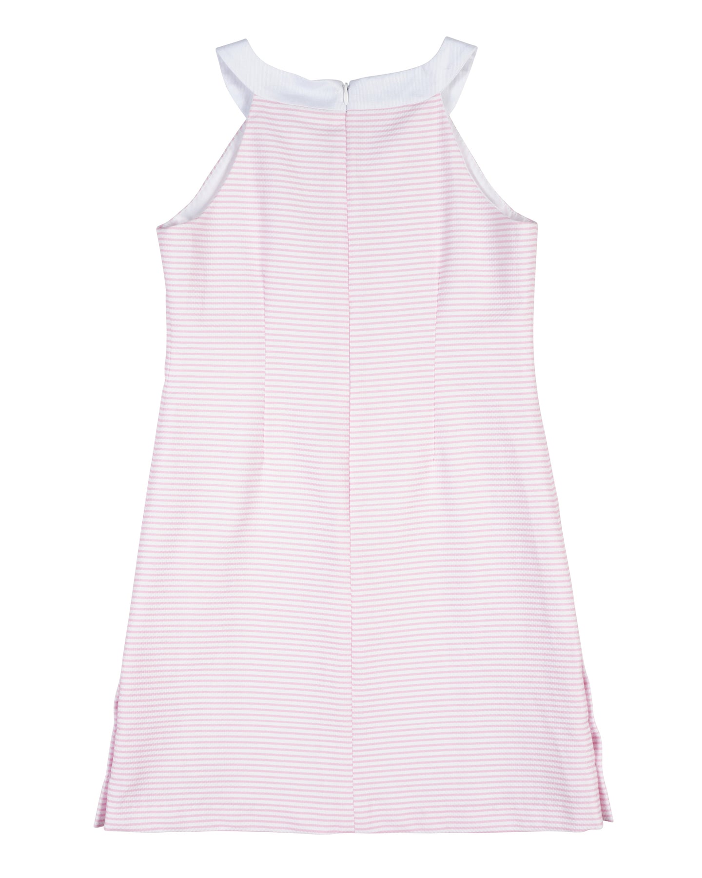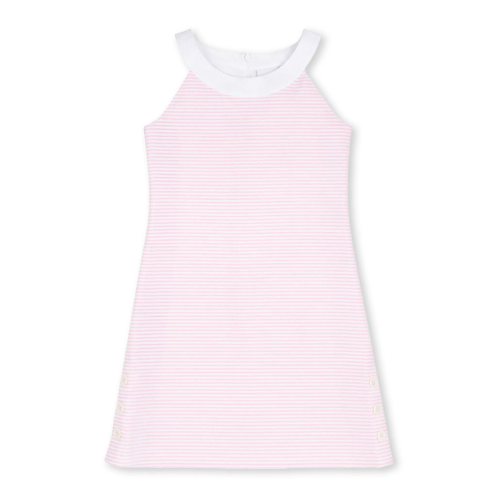 Classic and easy for sunny days, this dress is crafted from pink and white stripe birdseye piqué in soft, breathable 100% cotton. Decorative side buttons add a charming, polished detail to the simple silhouette.
