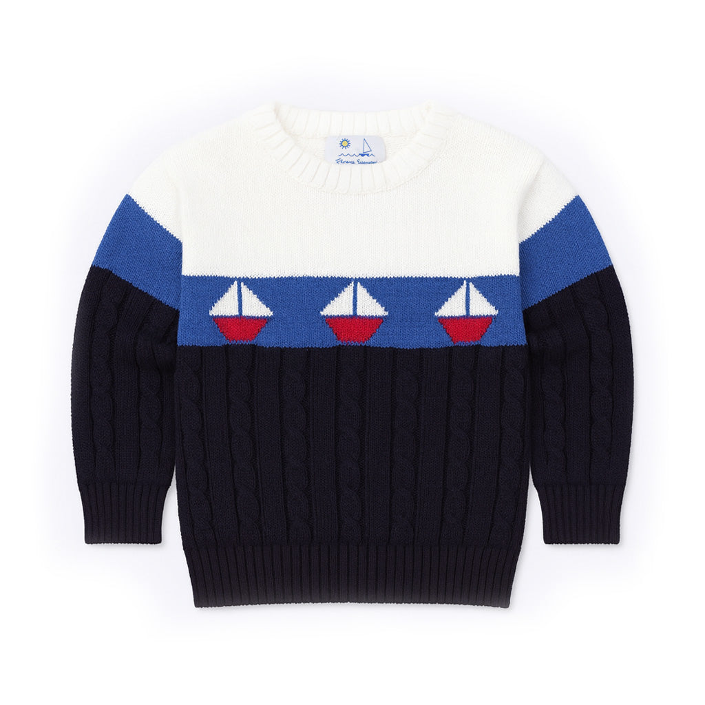 Regular price $96.00Full of coastal charm, this navy, blue, white, and red sweater knit features raised-texture intarsia sailboats that bring a playful three-dimensional detail to the design. A cable-knit texture at the lower body adds classic depth, while a crisp white rib at the neck and navy rib at the sleeve and body hems frame the look beautifully.