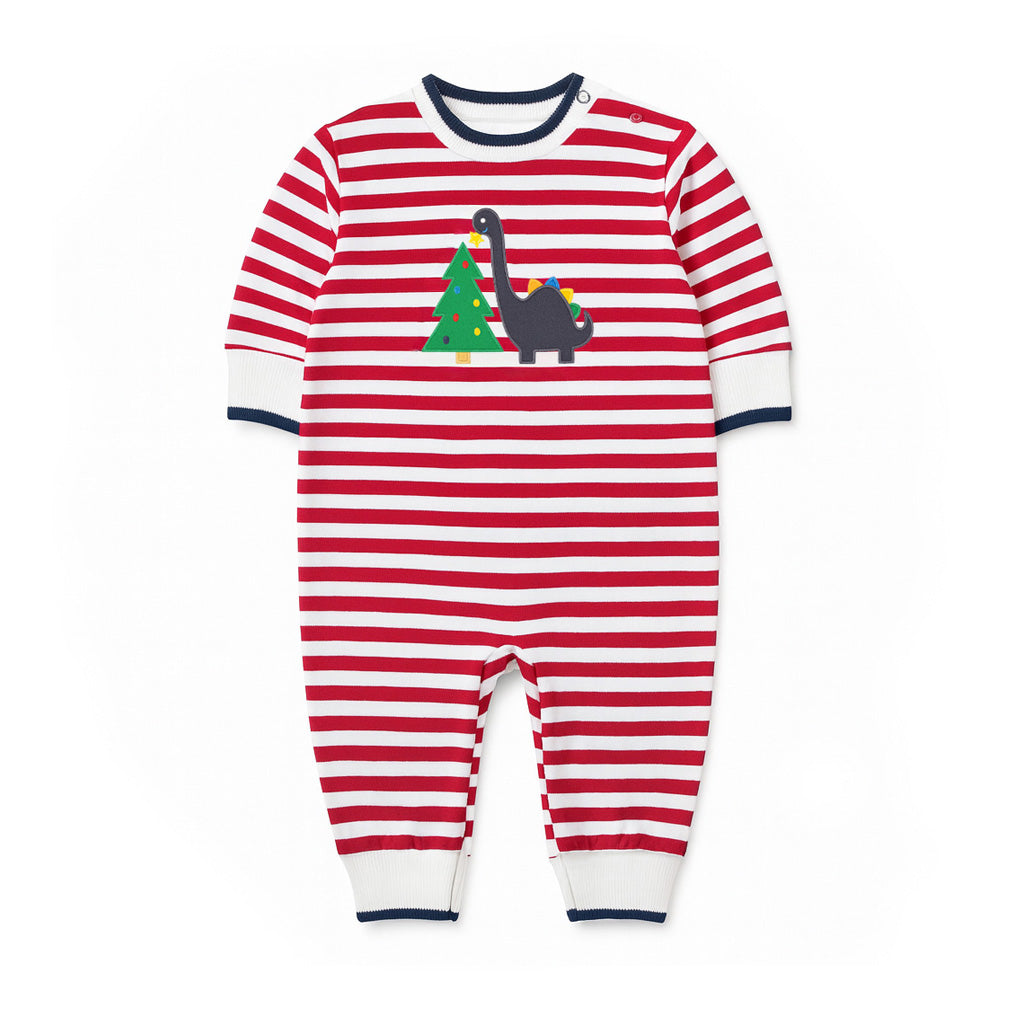 Regular price $92.00Whimsical and festive, this longall is crafted from red and white yarn-dyed stripe jersey knit with just the right touch of stretch. A playful appliqué dinosaur stands beside a Christmas tree, bringing a fun twist to a holiday classic.