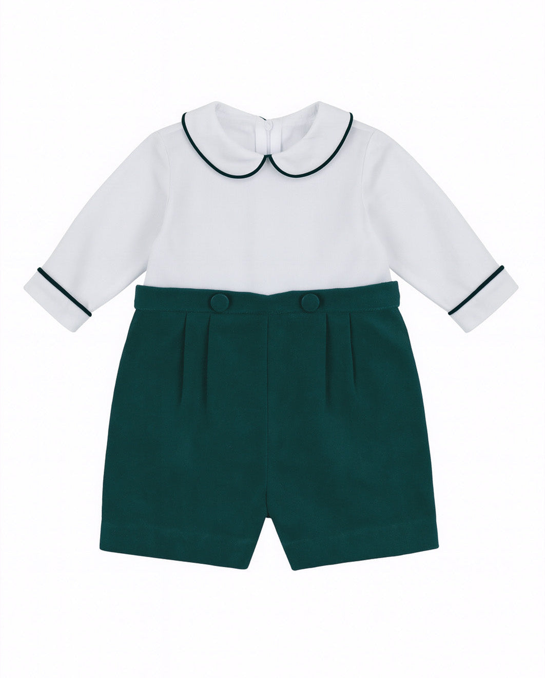 Regular price $108.00Festive and refined, this all-in-one shortall pairs rich green twill velvet with crisp white piqué for a polished holiday look. The attached shirt features a Peter Pan collar, creating the appearance of a layered ensemble with the ease of a single piece.