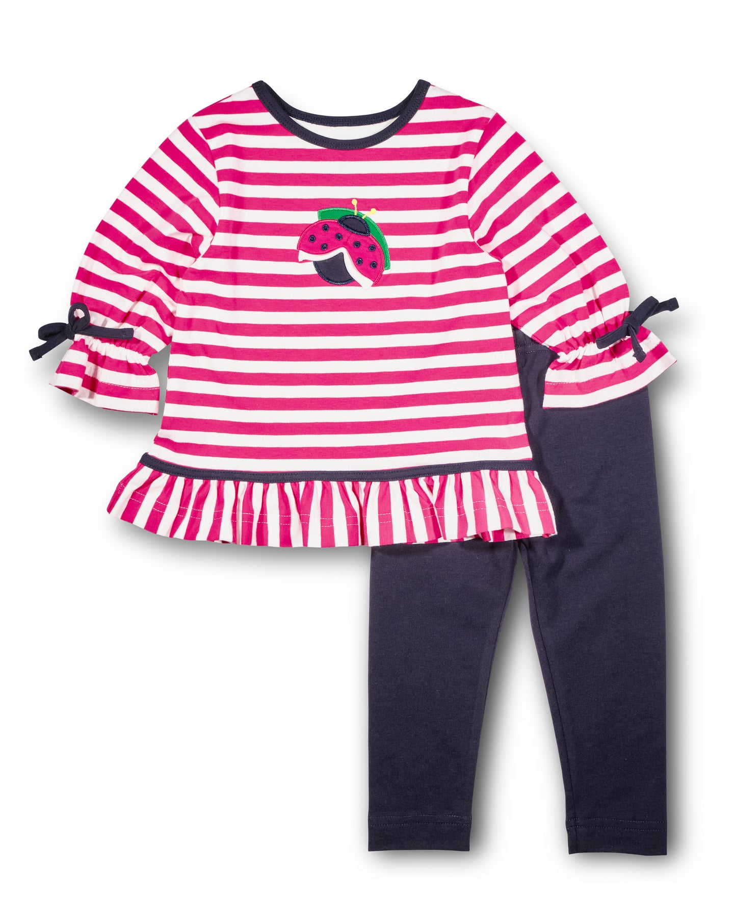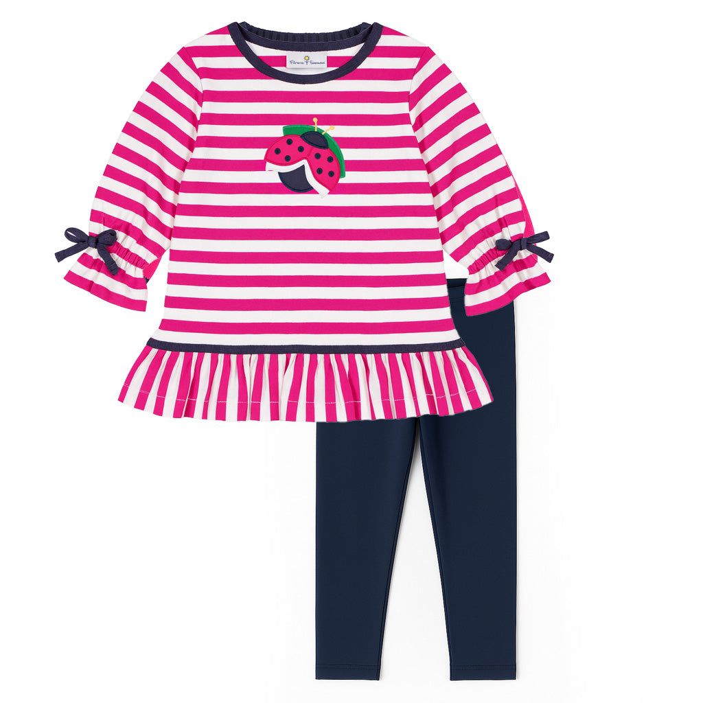 Regular price $108.00Playful and polished, this two-piece set pairs a fuchsia and white yarn-dyed stripe jersey knit tunic with classic navy leggings. A 3-D appliqué ladybug adds cheerful detail to the top, while navy binding, waist trim, and spaghetti ties at the sleeves complete the look.
