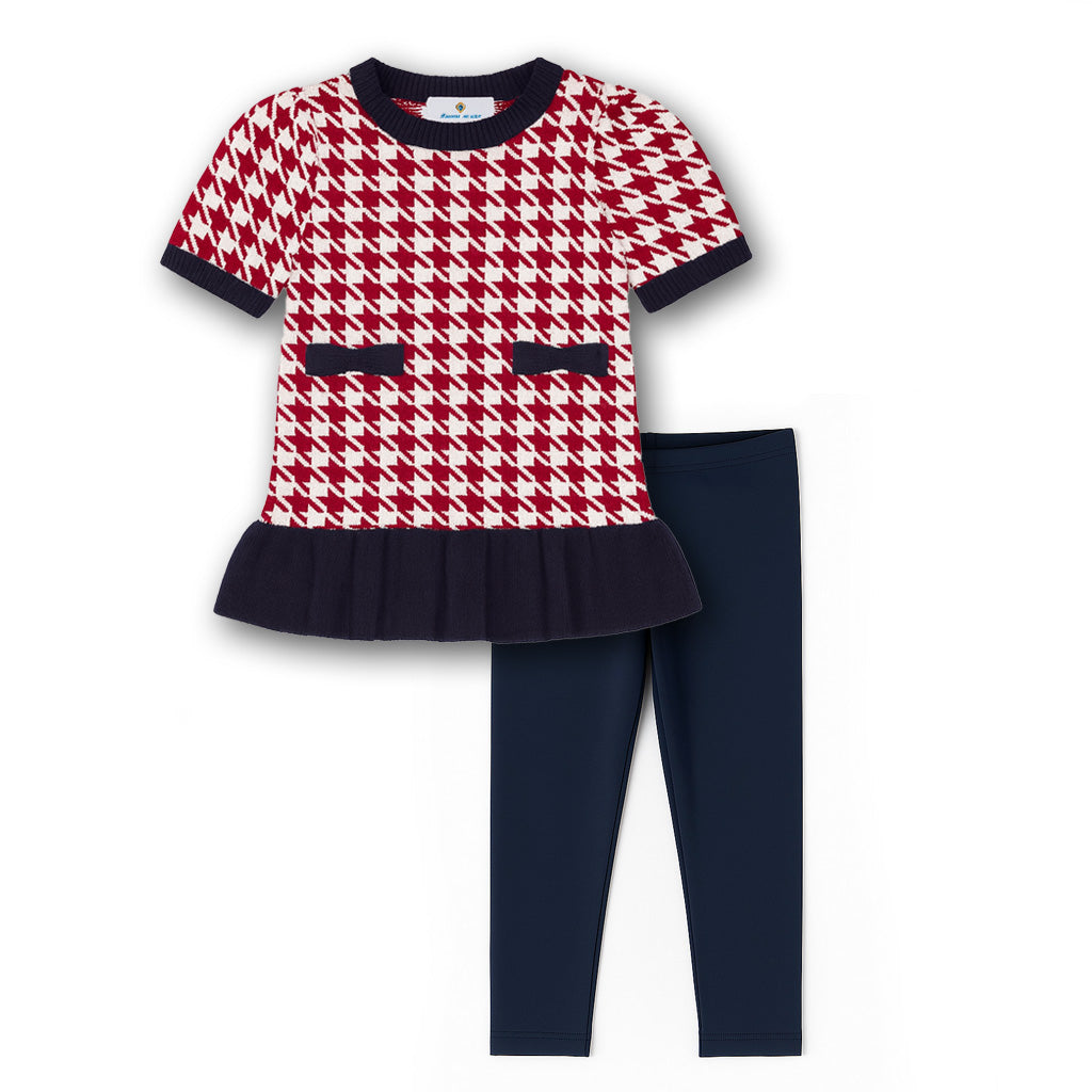 Regular price $128.00Classic patterns meet playful detail in this two-piece set. The tunic is knit from red and navy cotton yarns in a jacquard houndstooth design, finished with faux welt pockets topped by sweet bows for a polished touch.