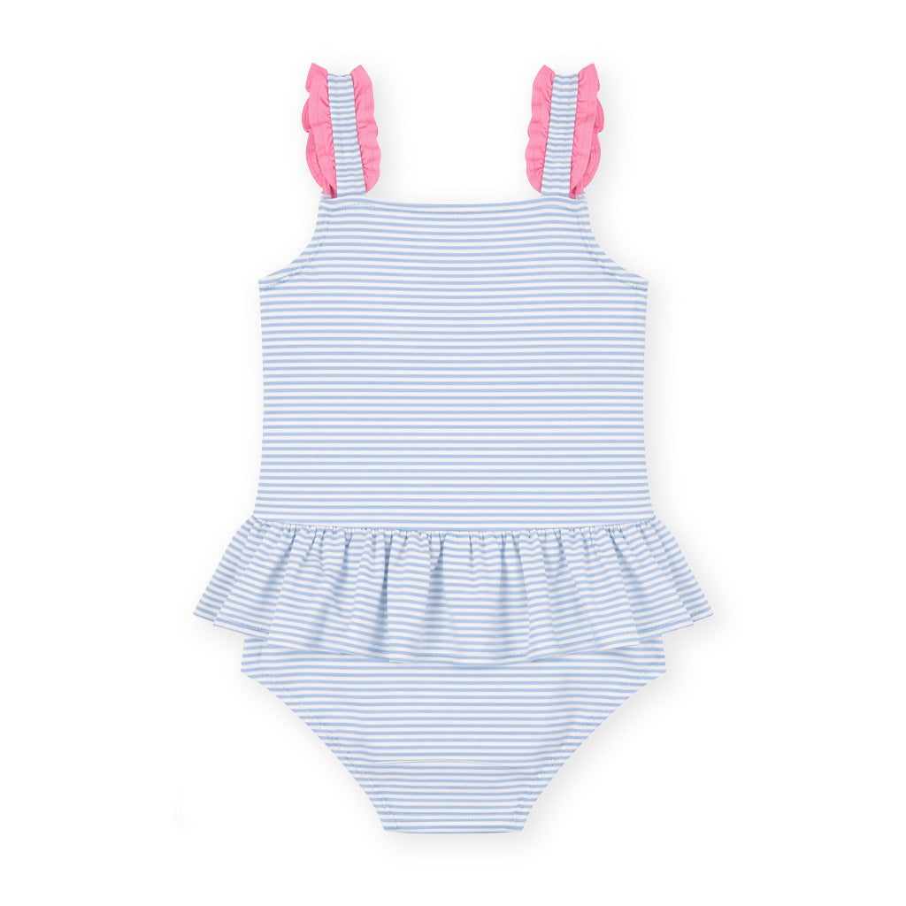 Regular price $108.00Sweet, sunny, and made for splashing, this skirted tank suit is crafted from light blue and white stripe seersucker swim fabric with gentle stretch for a comfortable, secure fit. Bright appliqué flowers bloom across the front, while ruffled straps add playful charm.