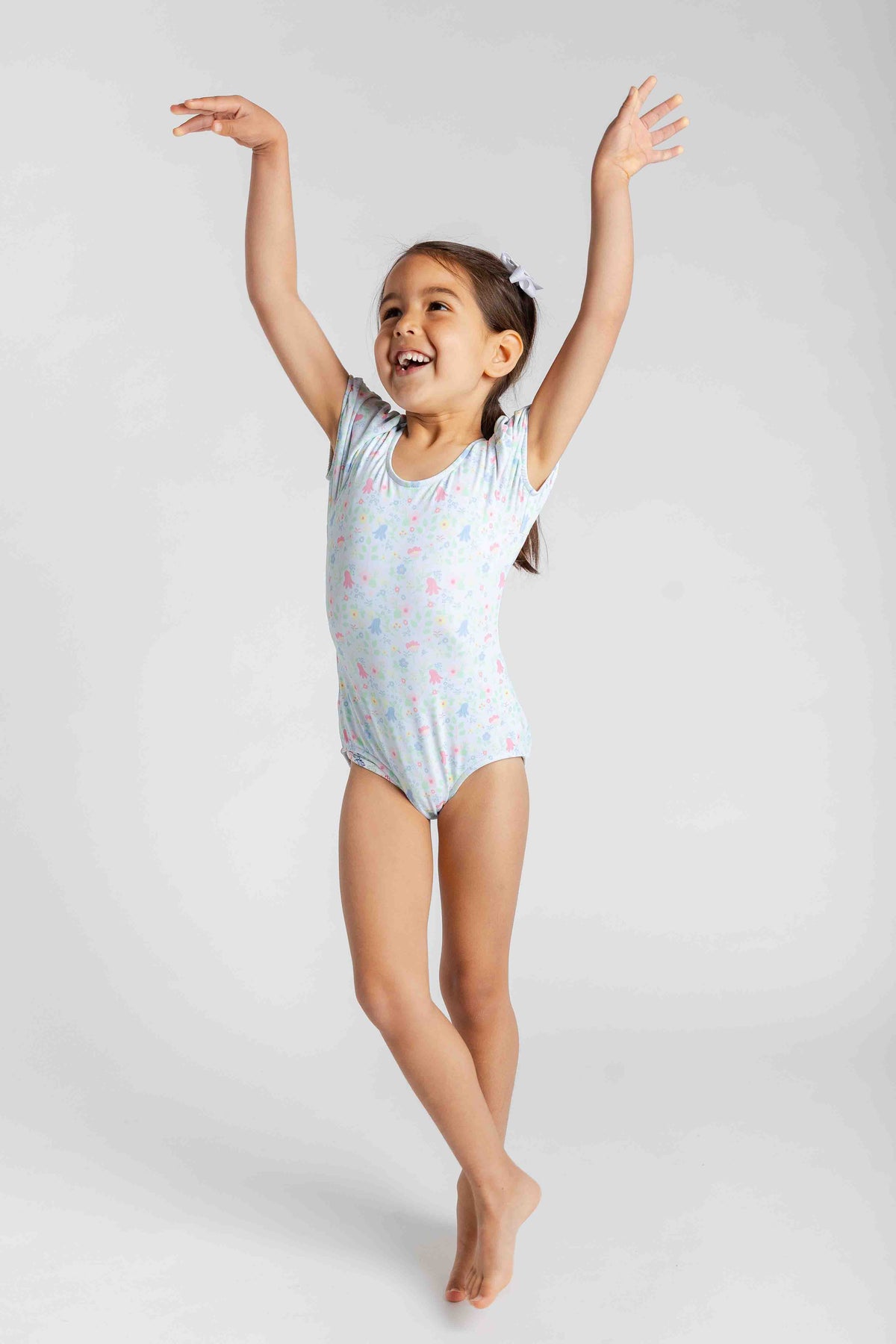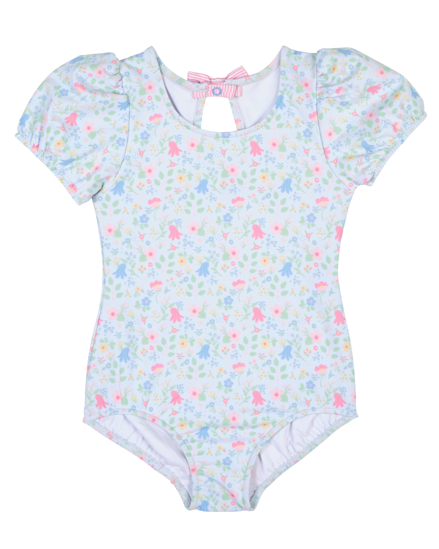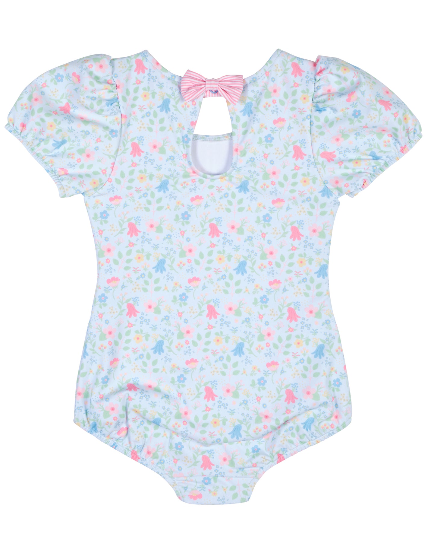 Regular price $108.00Sweet, sunny, and full of charm, this swimsuit is crafted from our custom blue and multicolor floral print on a soft, stretchy nylon-spandex blend. Puff sleeves add a playful, vintage-inspired touch, while a striped bow at the back—secured with a snap—makes for a picture-perfect finish.